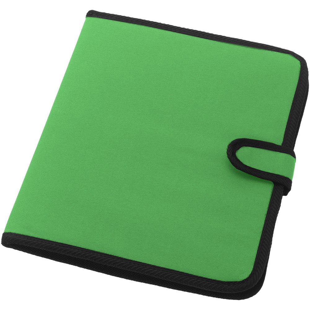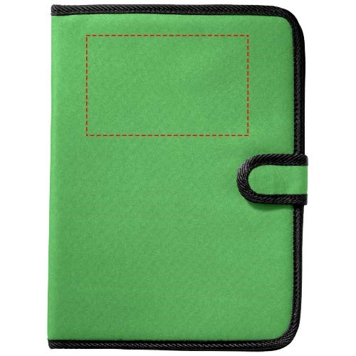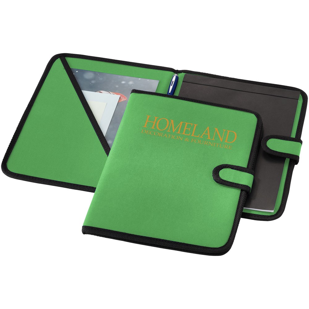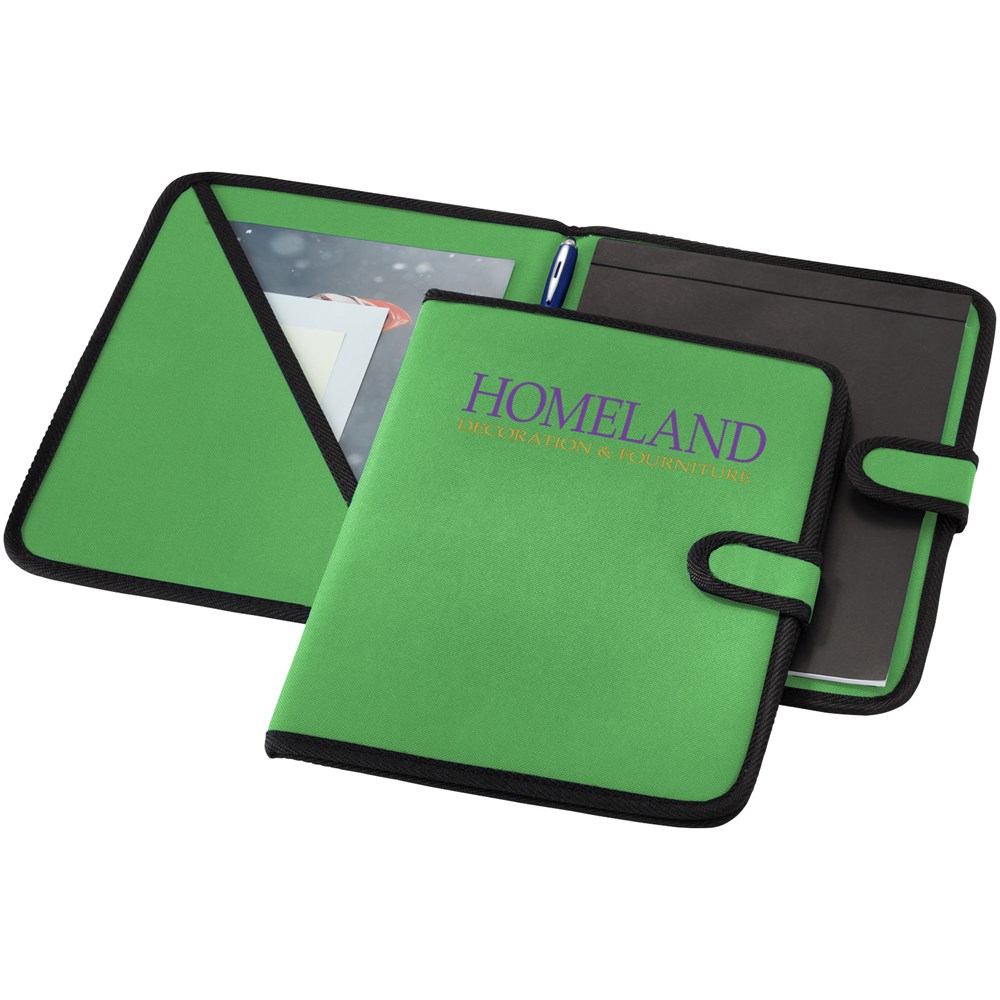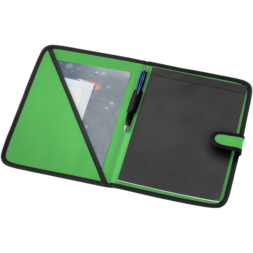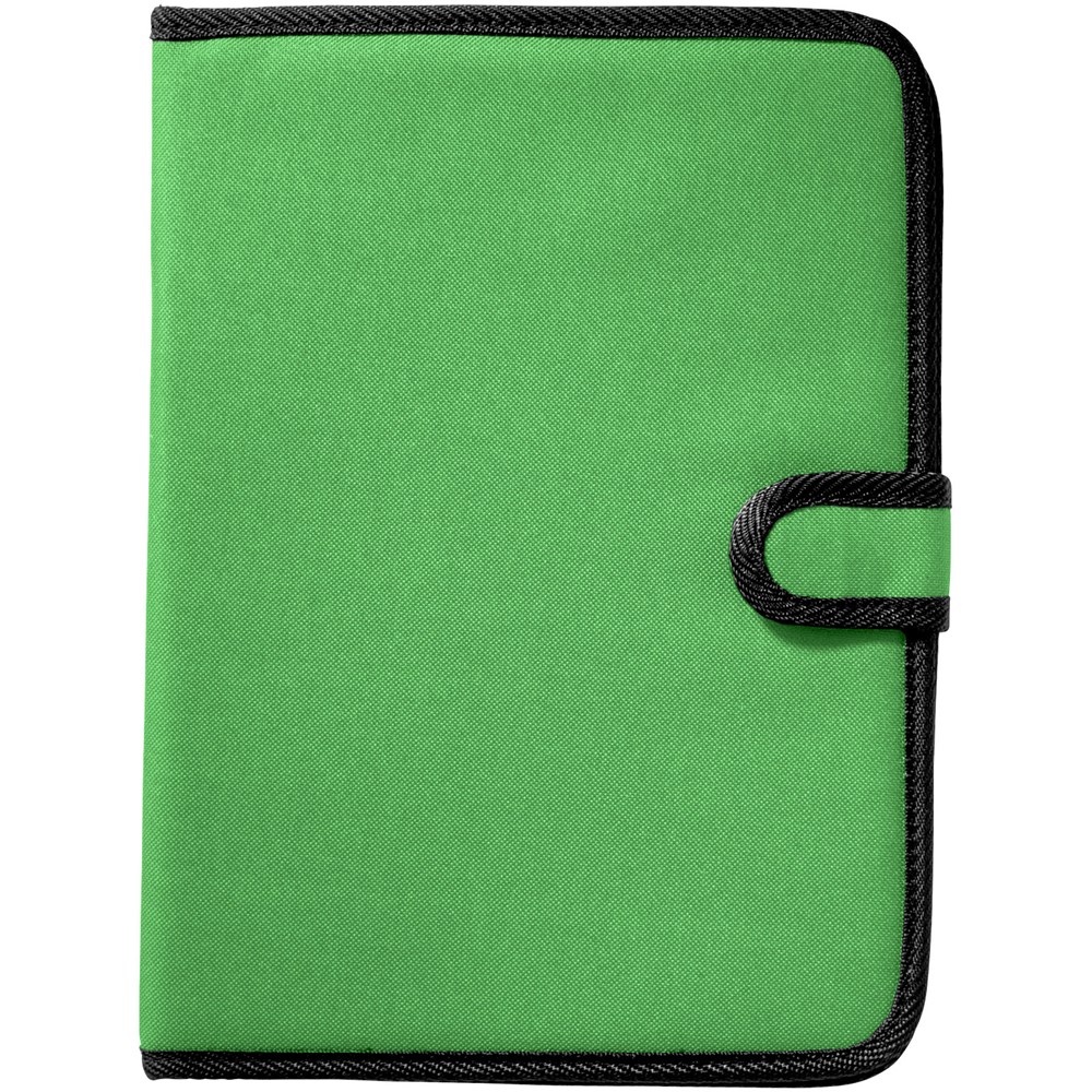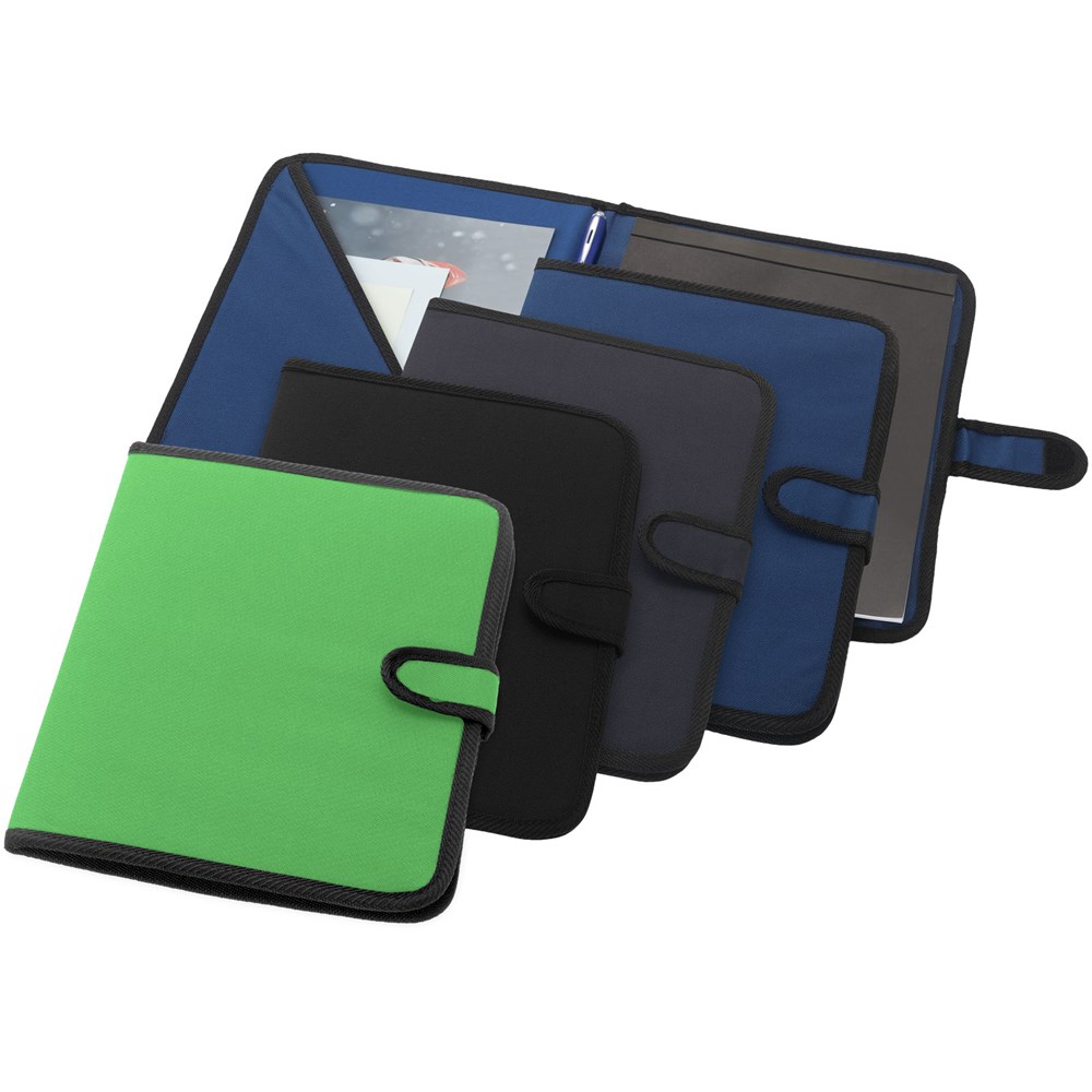 Mappe mit Klettverschluss, Stiftschlaufe, Dokumentenfach und Notizblock mit 20 Blatt, liniert.