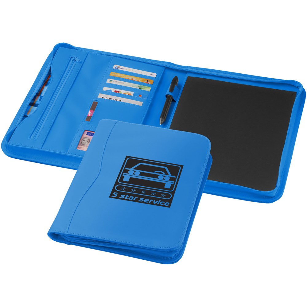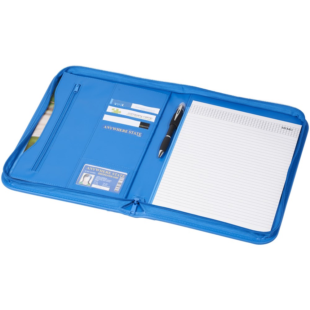 Mappe mit Reißverschluss, Stiftschlaufe, Reißverschlusstasche, Dokumentenfächern und Notizblock mit 20 Blatt.