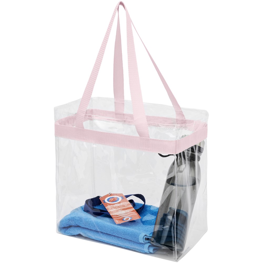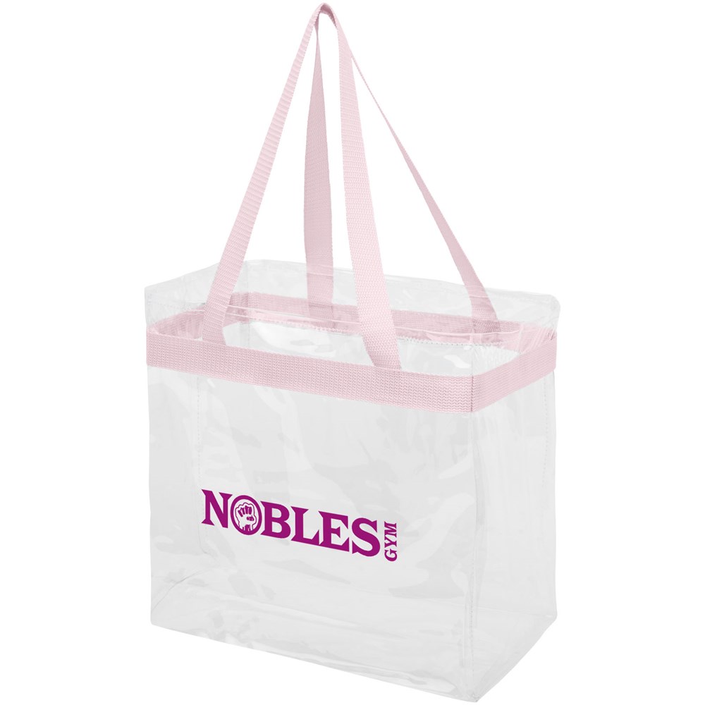 Diese durchsichtige Tasche ist perfekt für Fans auf dem Weg ins Stadion und die sichere Unterbringung von Dingen für Veranstaltungstage. Auch großartig für die Sicherheit bei der Arbeit und in der Schule geeignet. Offenes Hauptfach mit sportlicher Bandverzierung und zwei Henkeln. 27 cm lange Tragegriffe.