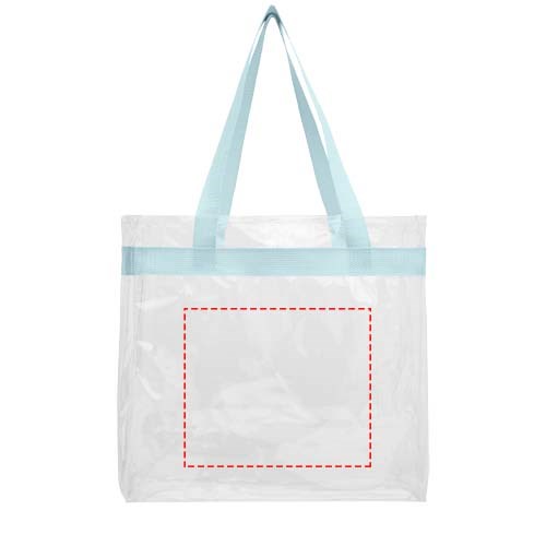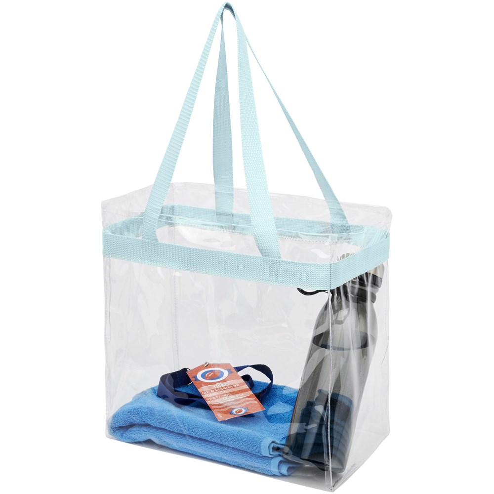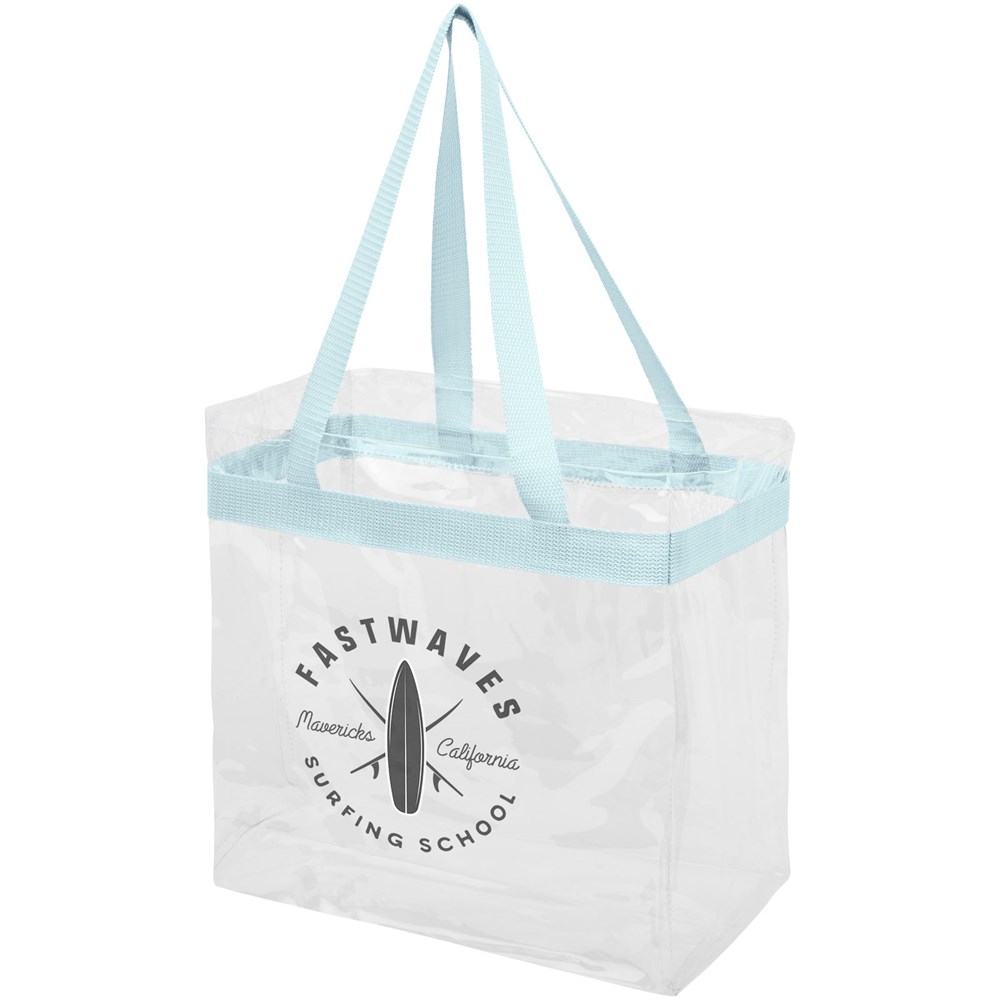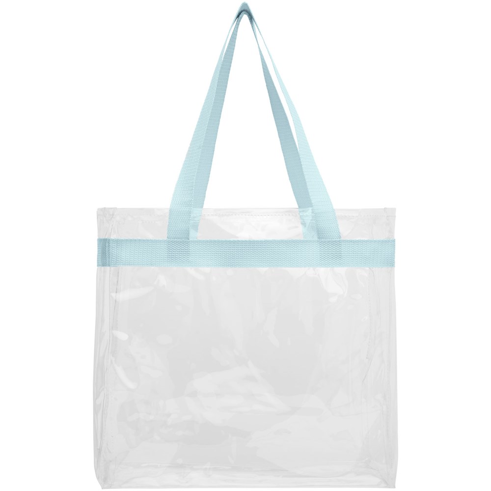 Diese durchsichtige Tasche ist perfekt für Fans auf dem Weg ins Stadion und die sichere Unterbringung von Dingen für Veranstaltungstage. Auch großartig für die Sicherheit bei der Arbeit und in der Schule geeignet. Offenes Hauptfach mit sportlicher Bandverzierung und zwei Henkeln. 27 cm lange Tragegriffe.
