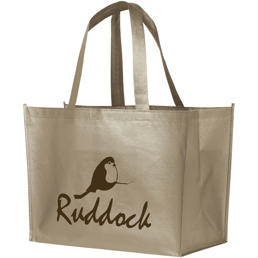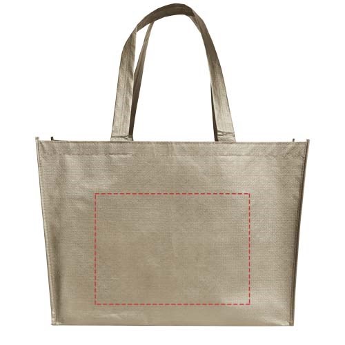 Eine leichte, flexible Einkaufstasche mit einem beschichteten und glänzend-metallischen Aussehen. Aus 80 g beschichtetem Polypropylen-Vlies hergestellt.