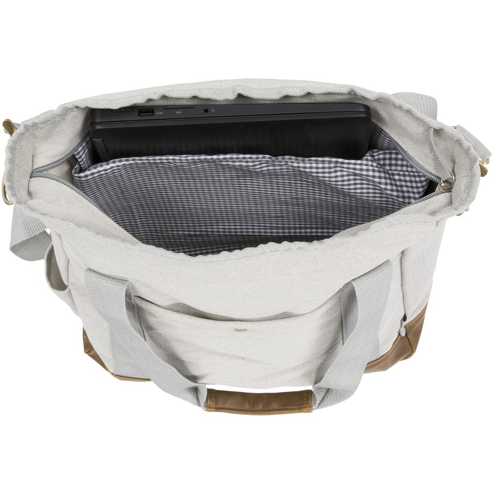 Diese trendige Tragetasche aus Baumwollcanvas mit Reißverschluss hat ein offenes Hauptfach mit gemustertem Futter und eine Fronttasche mit Schnappverschluss. Akzent-Boden und Tragegriffe aus Vinyl. Rückseite für das Anbringen an einem Trolley. Schulterriemen mit einstellbarer Länge. Teil der Field & Co.® Harper Baumwollcanvas-Kollektion.