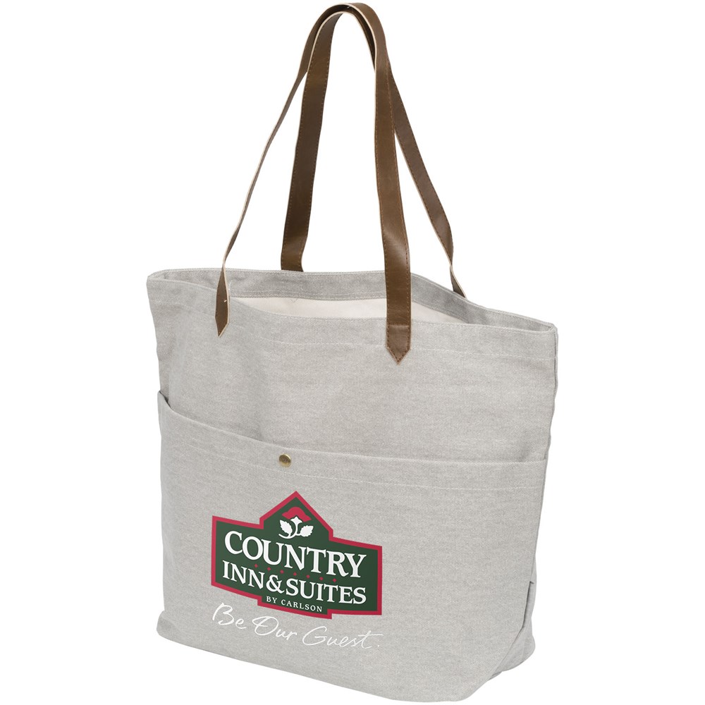 Diese trendige Canvas-Buchtragetasche hat ein offenes Hauptfach und eine praktische Fronttasche mit Schnappverschluss. 30 cm lange Vinyl-Tragegriffe. Haltbarer 450 g schwerer Baumwollcanvas. Teil der Field & Co.® Harper Baumwollcanvas-Kollektion.