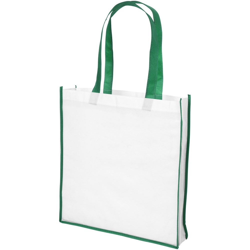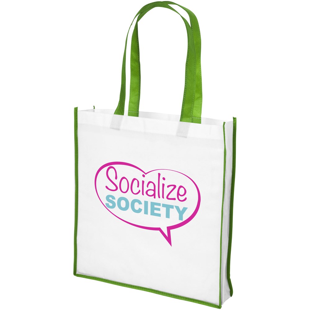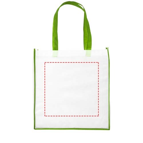 Eine Einkaufstasche aus PP-NonWovenmaterial mit farbigen Griffen und Kanten. Frisches und farbenfrohes Design. Große und praktische Version der Contrast Mini Einkaufstasche.