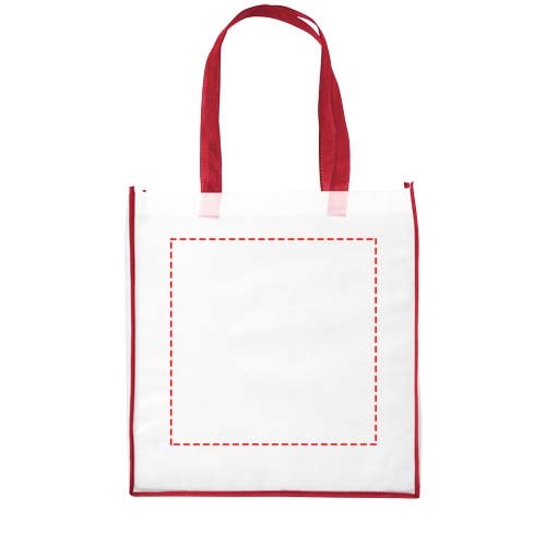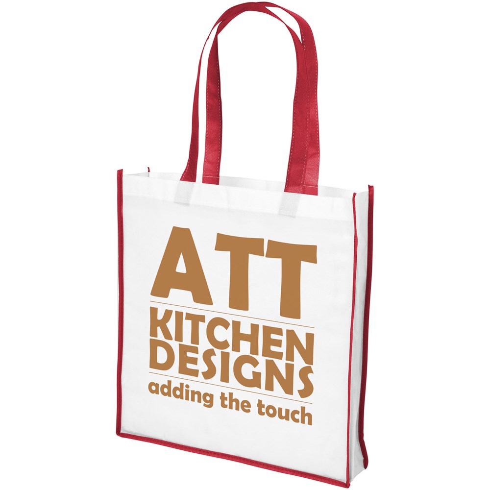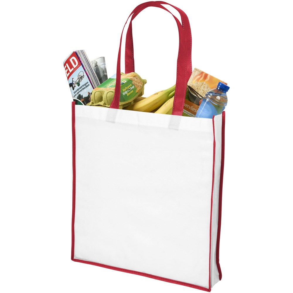 Eine Einkaufstasche aus PP-NonWovenmaterial mit farbigen Griffen und Kanten. Frisches und farbenfrohes Design. Große und praktische Version der Contrast Mini Einkaufstasche.