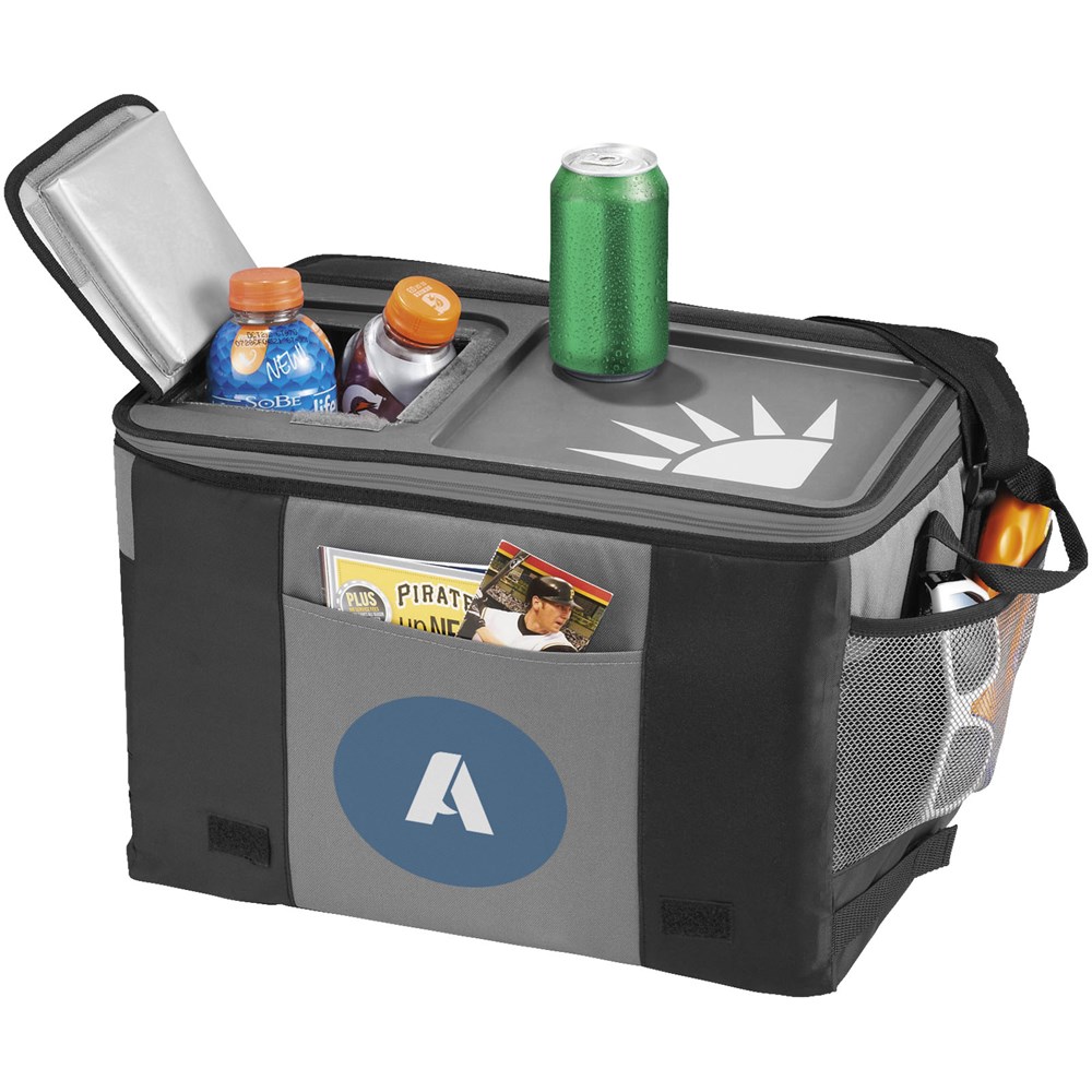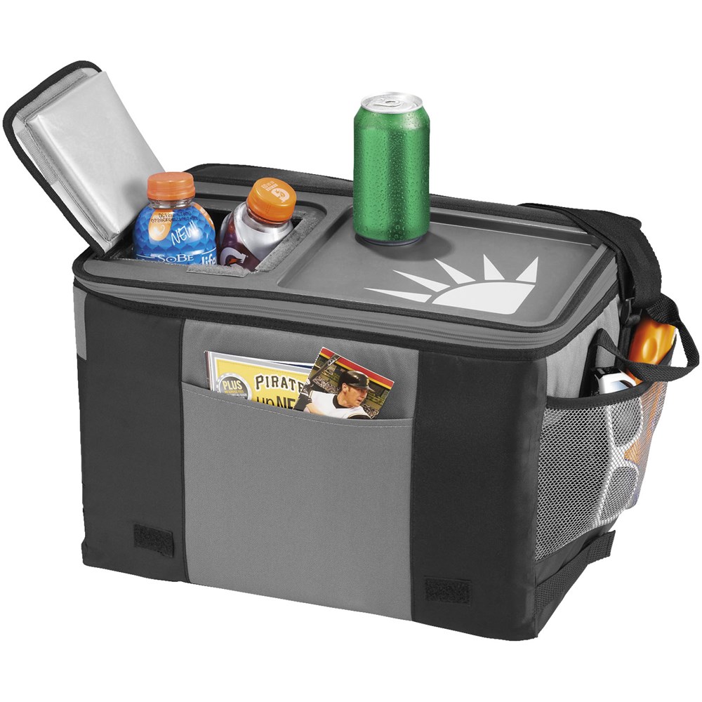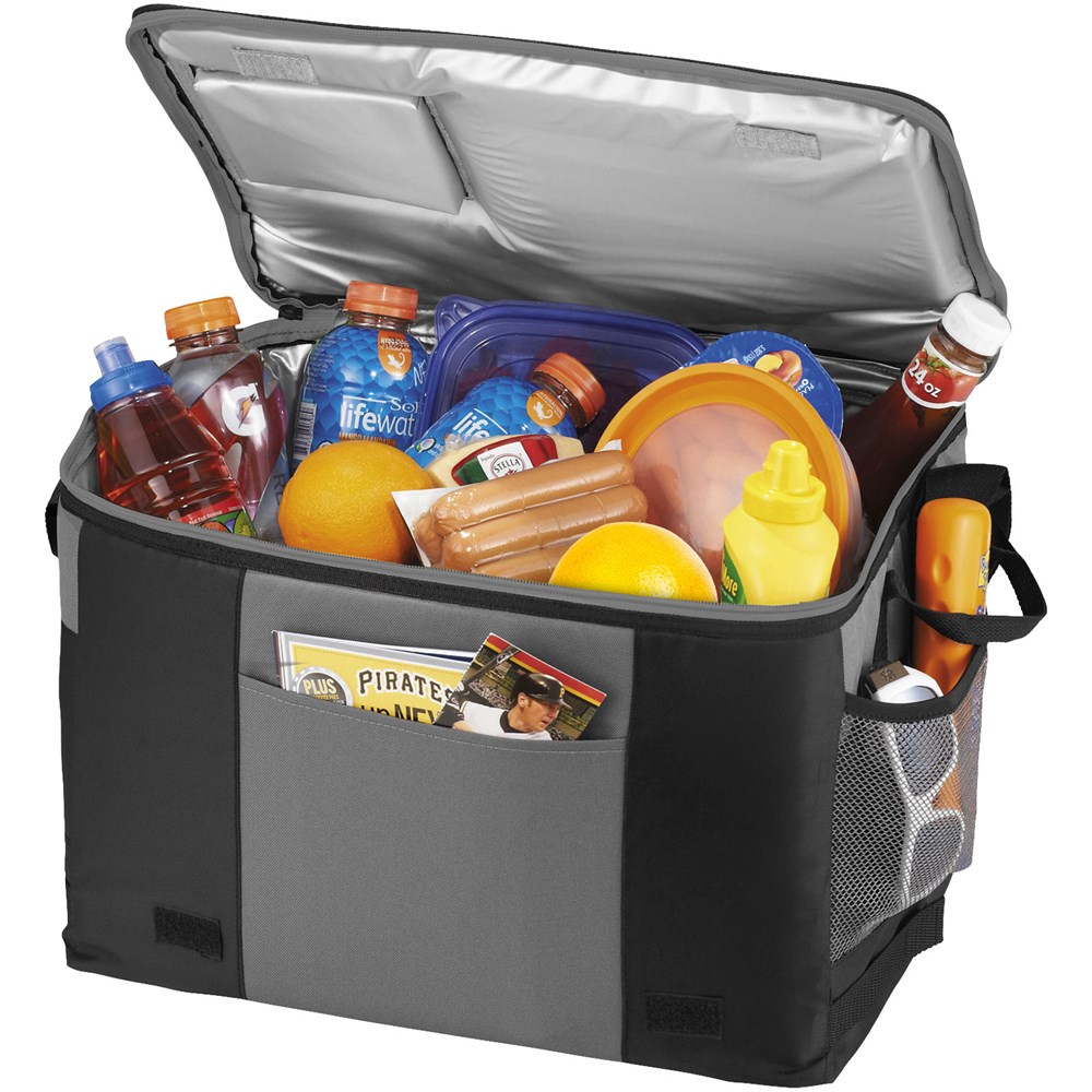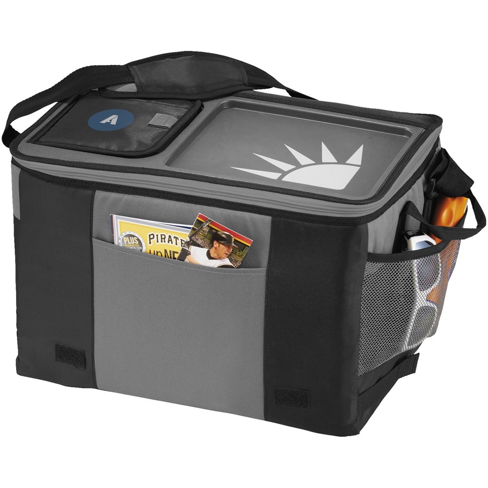 Das einzigartige Design dieser großen Kühltasche mit einfach zugänglichem Deckel und Tischfunktion macht sie perfekt für Veranstaltungen im Freien und längere Fahrten. Hauptfach mit Reißverschluss für bis zu 50 Dosen. Offenes Fach vorne. Seitliches Netzfach. Einfach zugängliches Fach mit Klettverschluss oben. Hardtop Deckel, zwei seitliche Tragegriffe außen. Backsaver® Technologie verringert die Belastung beim Tragen einer gefüllten Kühltasche. Auslaufsichere Ultra Safe™ PEVA Isolierung. Kann zum problemlosen Aufbewahren zusammengeklappt werden.