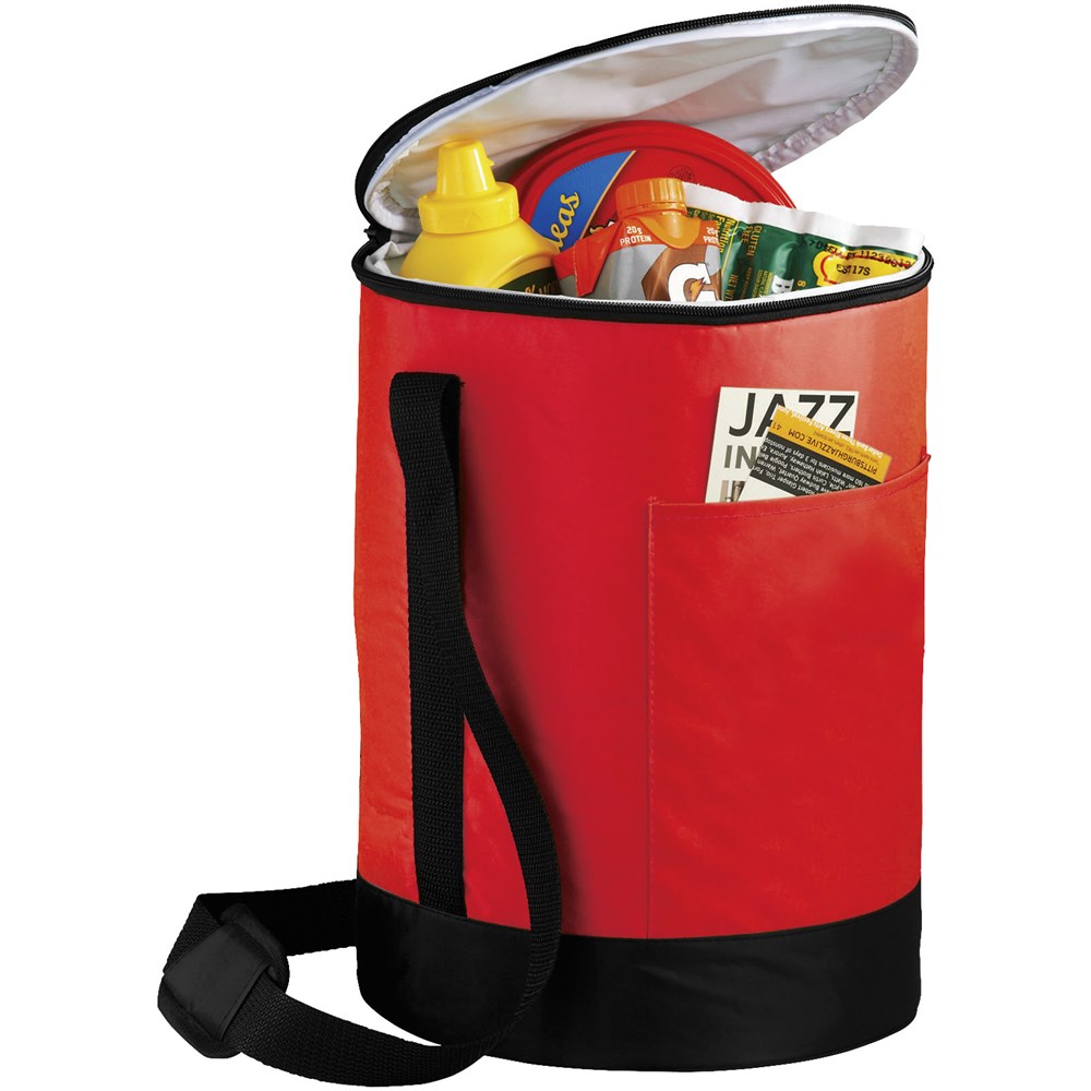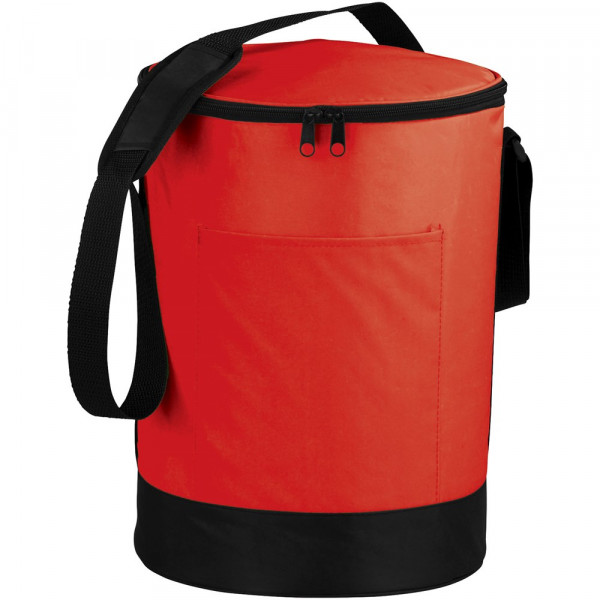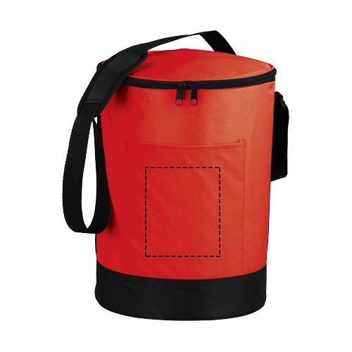 Fassförmig mit Hauptfach mit Reißverschluss. Offenes Fach vorne. Netzfach. Verstellbarer, gepolsterter Schulterriemen. PEVA Isolierung.