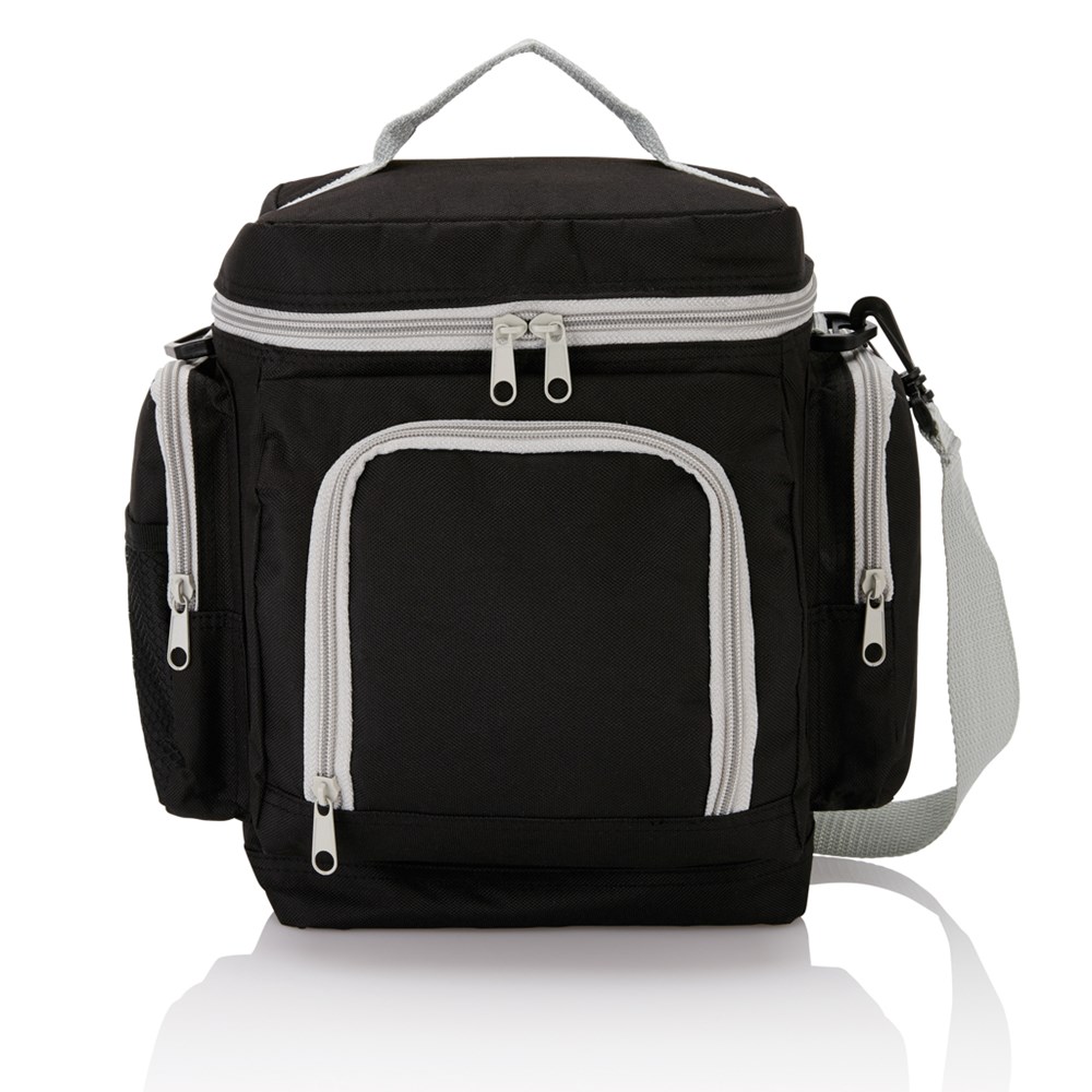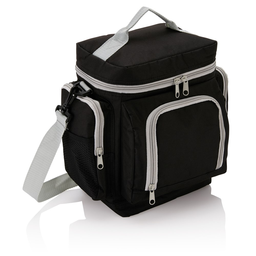Praktische 600D Polyester Kühltasche mit mehreren Fächern und verstellbarem Schulterriemen. PVC frei.