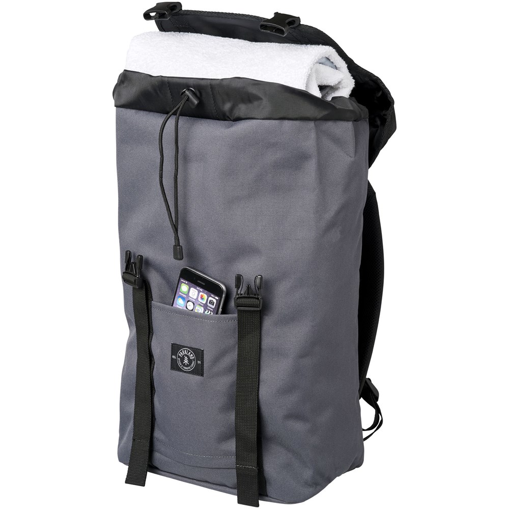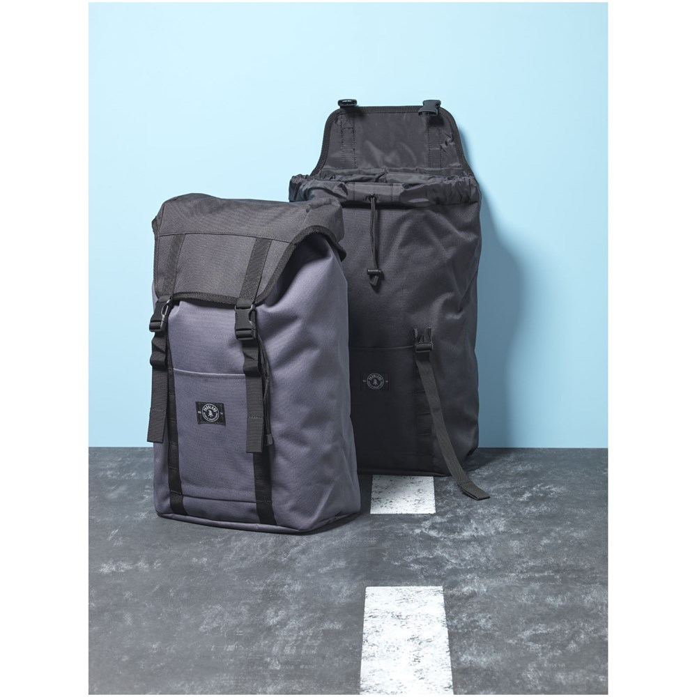 Die Außenseite der Tasche besteht aus 14 recycelten Kunststoff-Wasserflaschen. Ausgestattet mit einem von oben befüllbaren großen Hauptfach mit einer 15" Laptophülle, verstellbarer Kordelzugöffnung und Clipverschluss. Wird mit Mesh gepolsterten Trägern und einer zugänglichen Vordertasche geliefert. Kapazität: 35 Liter.
