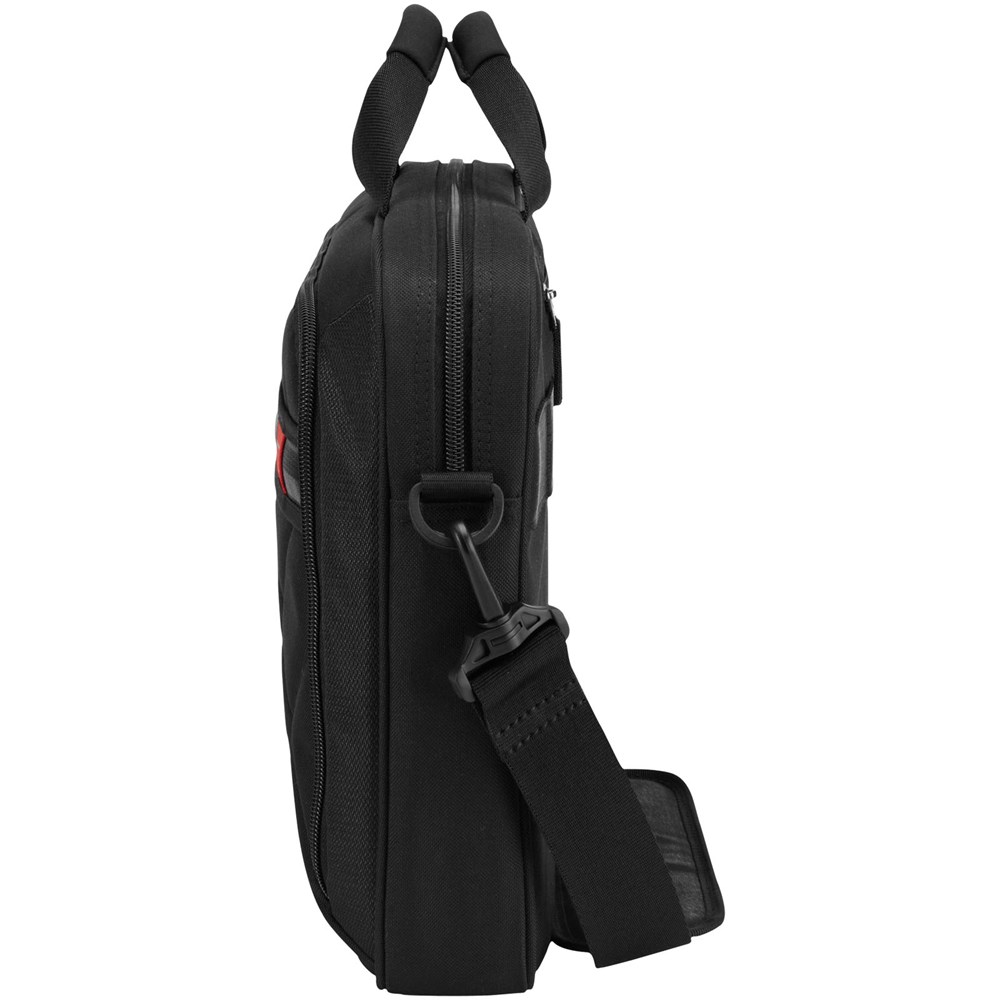 Diese asymmetrisch gesteppte Tasche mit speziellem Laptopfach passt für Laptops mit einem bis zu 15" großen Display. Nylexgefütterte, gepolsterte Tasche schützt ein bis zu 10" großes Tablet. Einteilung in der Fronttasche dient der Aufbewahrung Ihres Mobiltelefons, iPod® und grundlegender Geschäftsutensilien und bietet außerdem reichlich Platz für Netzkabel. Neoprengepolsterte Tragegriffe und ein abnehmbarer, rutschfester Schulterriemen bieten bequeme Tragemöglichkeiten. Schlaufe entlang der Rückseite kann ganz einfach über den Griff eines Rollkoffers geschoben werden.