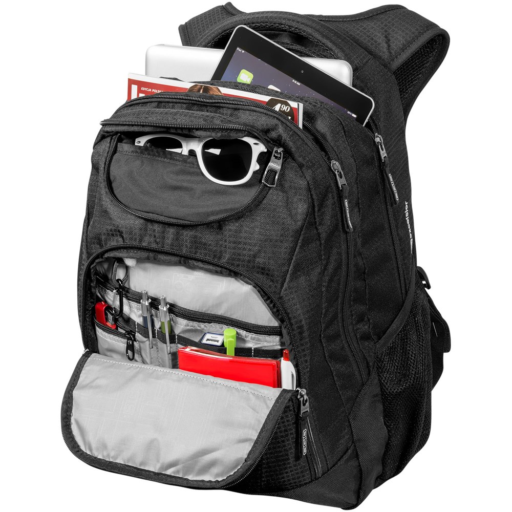 17" Computer Rucksack mit dualem Hauptfach und ultra-gepolstertem Netzrücken. Tasche bietet ein gepolstertes Laptopfach mit separater Tablethülle, eine Vordertasche mit Reißverschluss und Organisationssegment sowie Schlüsselanhänger, eine Einschubtasche vorne für schnellen Zugriff und eine Fleece-Tasche für Ihre Wertsachen. Ergonomische gepolsterte Schultergurte mit verstellbarem Brustgurt.