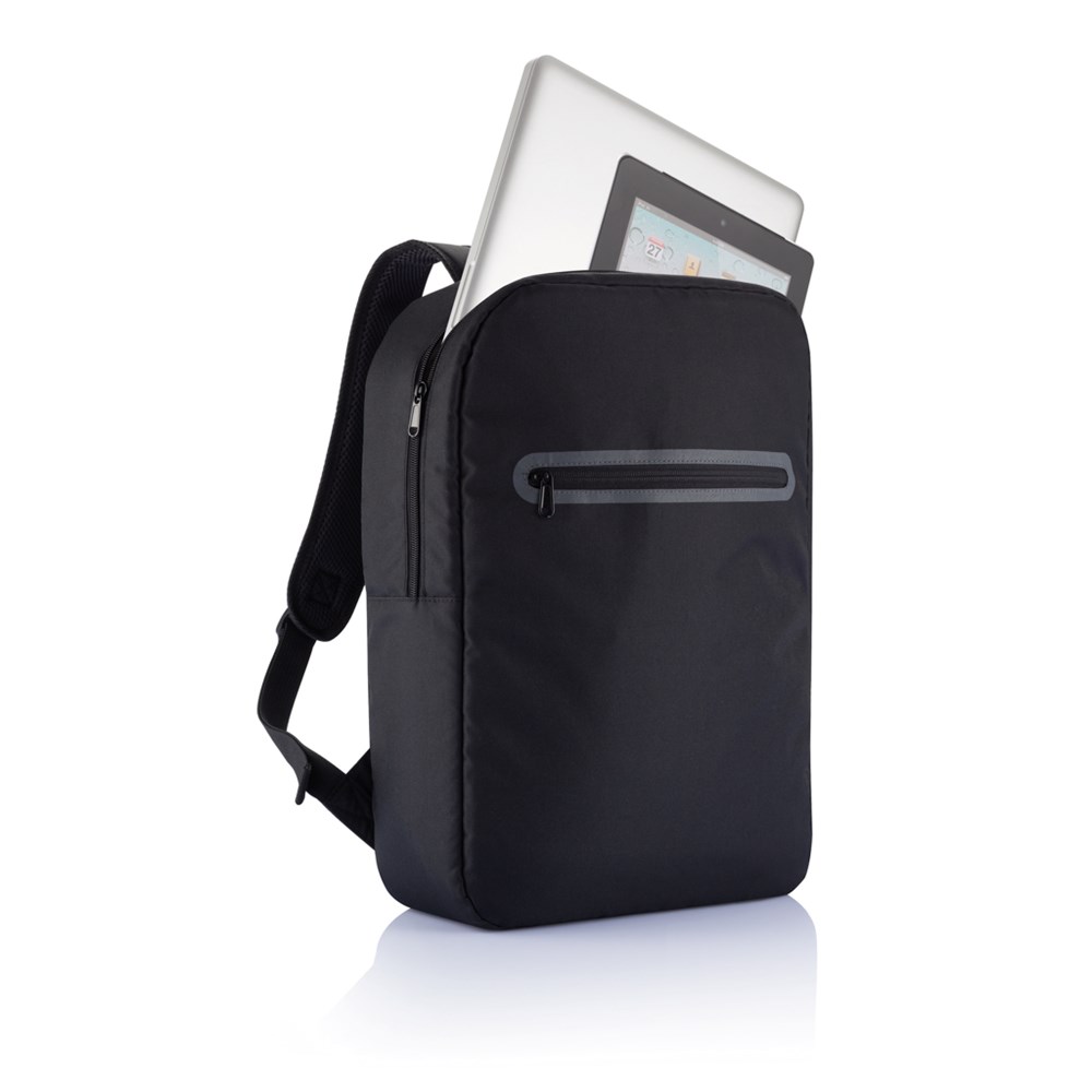 300D Polyester Laptop-Rucksack mit Hauptfach, der ein separates Fach für Ihr Tablet und ein Organizerfach enthält. PVC-frei.
