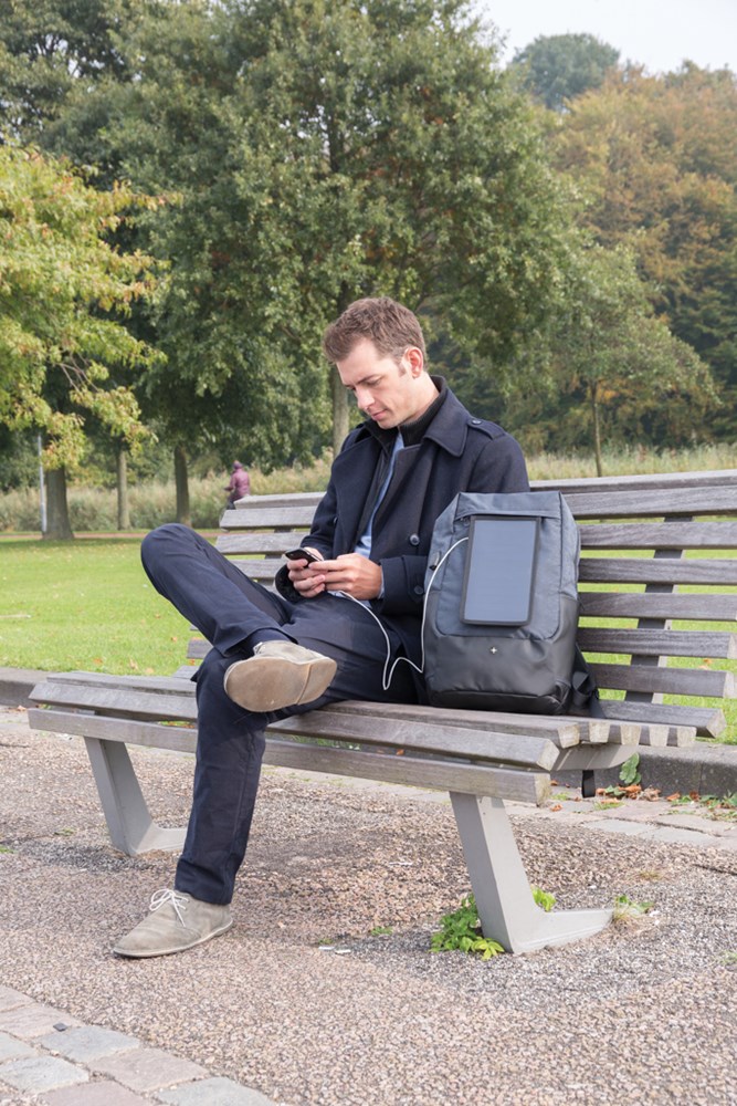 15,6” Laptop-Rucksack mit einem hochentwickelten Solarpanel der dritten Generation vom Marktführer SunPower. Das Solarpanel mit 7W kann Ihr Smartphone je nach Lichteinstrahlung in bis zu 3-4 Std. vollständig laden. So laden Sie sogar unterwegs Ihre Kamera, Ihr Smartphone oder Ihre Powerbank auf. Und durch die 2 USB-Ausgänge können sogar 2 Geräte zeitgleich geladen werden. Das Sonnenlicht wird sofort in Energie umgewandelt. Registered design®