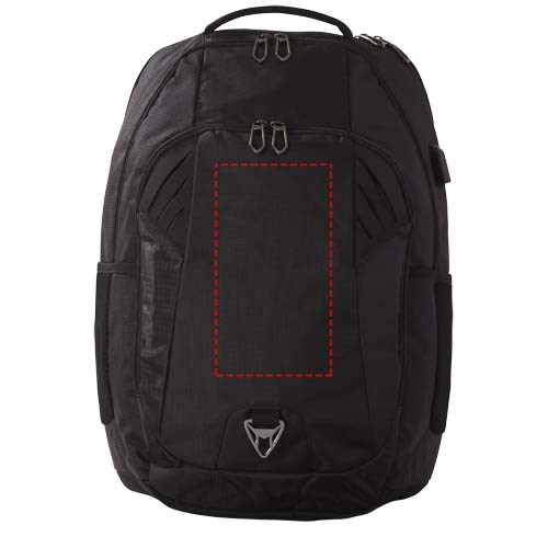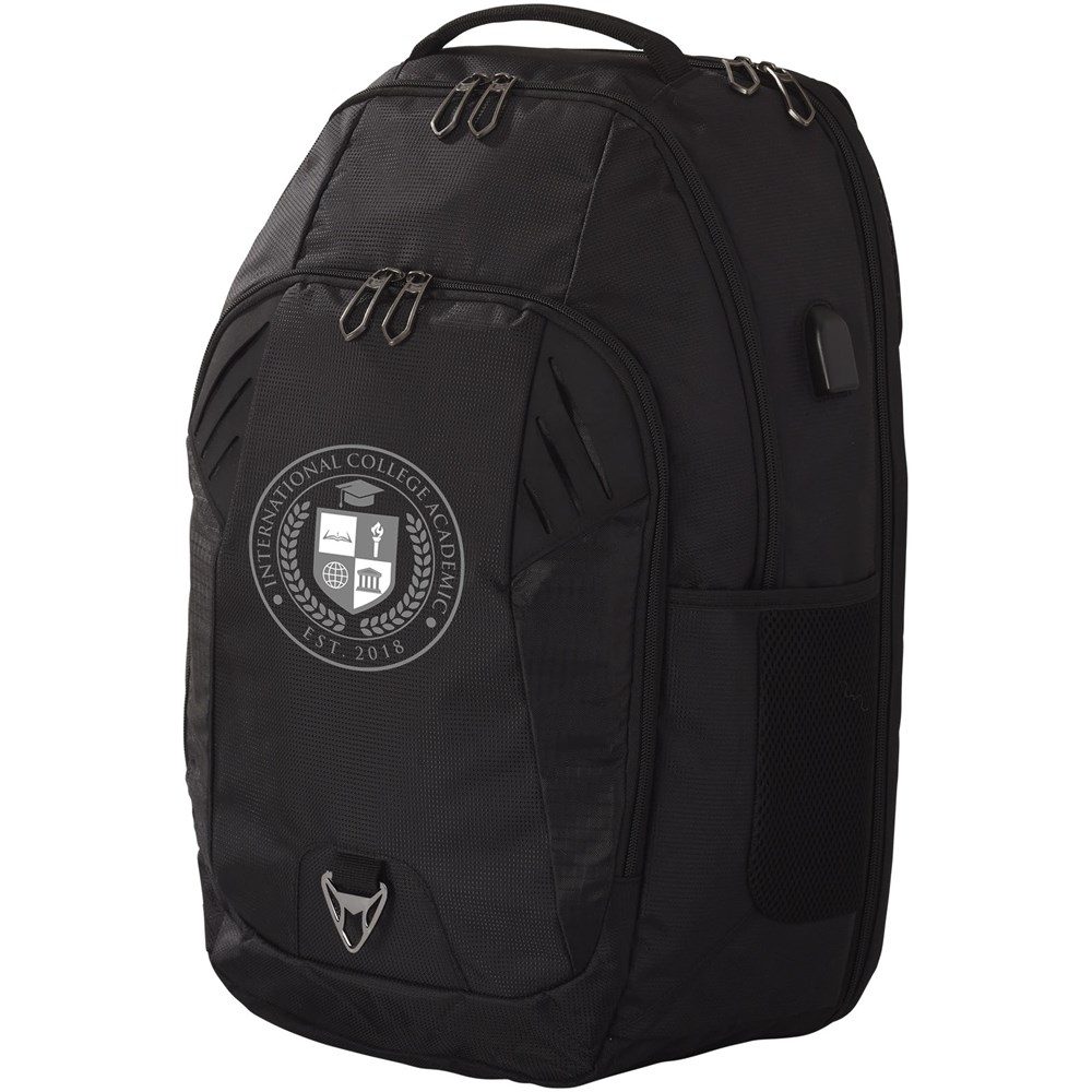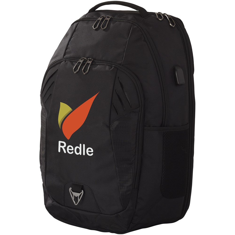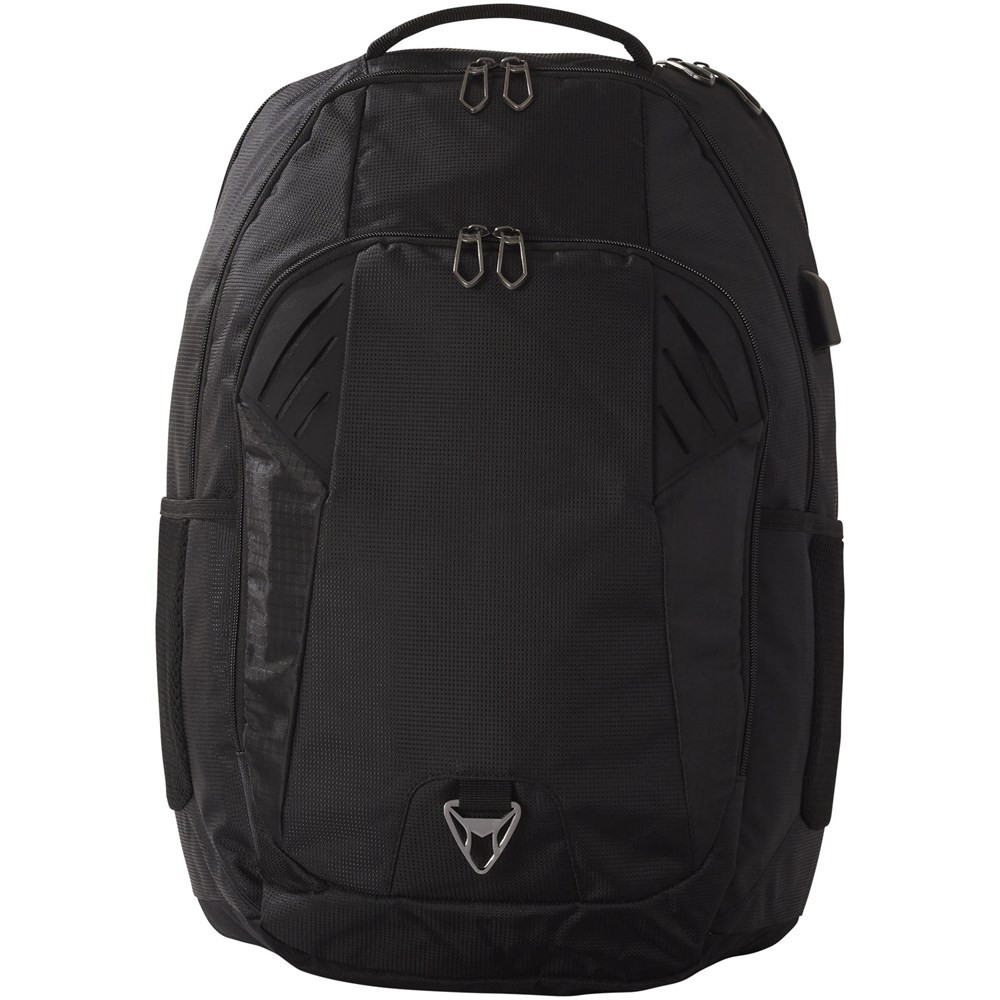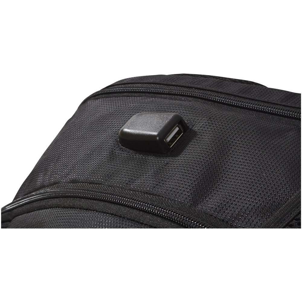 Ein 15" TSA Laptop Rucksack, der Ihre Geschwindigkeit bei Sicherheitskontrollen, durch ein gepolstertes Laptopfach erhöht, da es flach ausgefaltet werden kann, sodass beim Röntgen alles gut zu sehen ist. Das große Reißverschluss-Hauptfach bietet reichlich Platz für Ihr Tech-Zubehör und Tablet. Inkl. eingebautem USB-Port und Kabel, um Ihnen das Aufladen von Geräten unterwegs zu ermöglichen. Die Vorderseite der Tasche verfügt über ein luxuriöses Organisationsfach und zwei seitliche Netztaschen für Wasserflaschen. Inkl. benutzerdefiniertem Reißverschluss Puller, gepolsterter Rückwand für Komfort, Brustgurt und Trolley Befestigung.