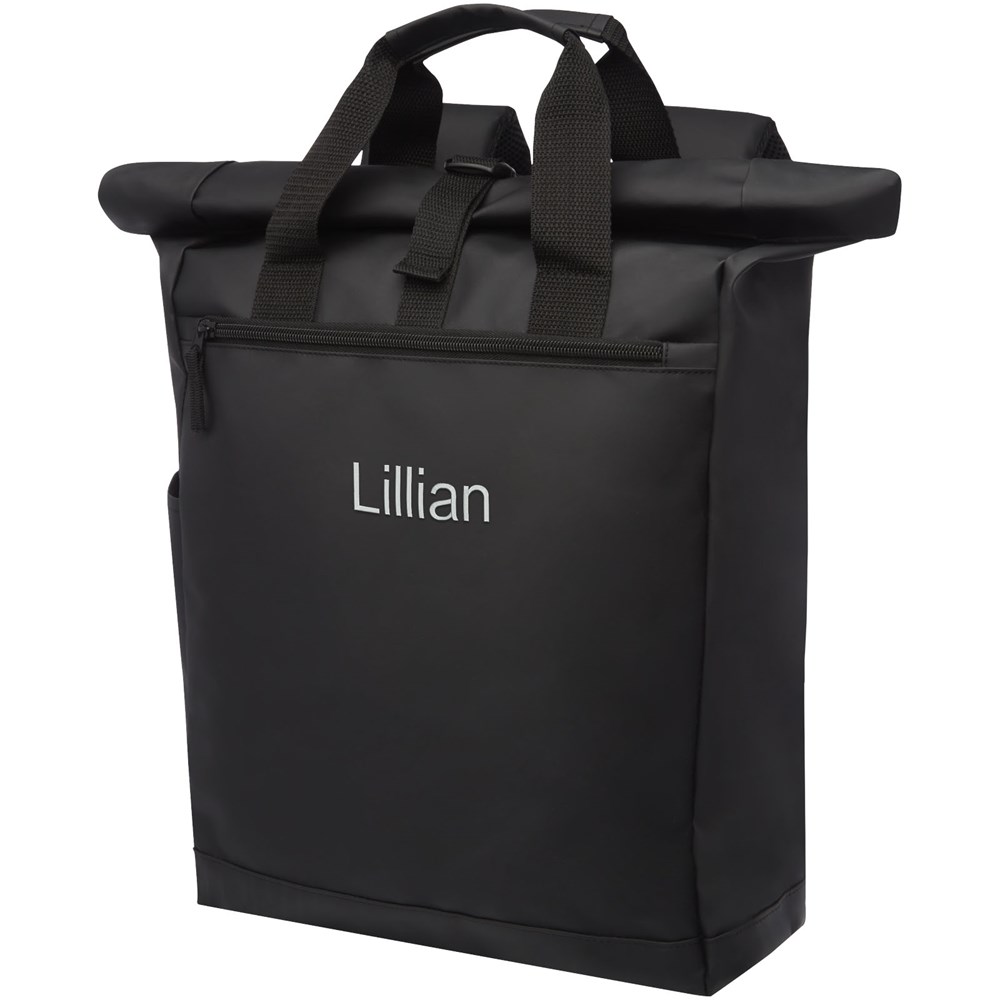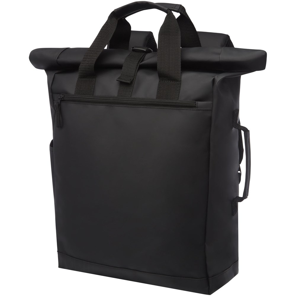 Wasserdichter Rucksack mit gepolstertem Laptopfach, gepolsterten verstellbaren Schultergurten, Hauptfach mit Reißverschluss und Rollverschluss sowie zwei Tragegriffen.