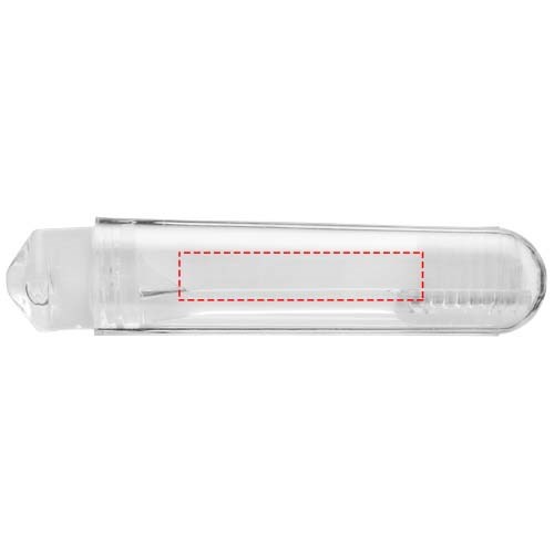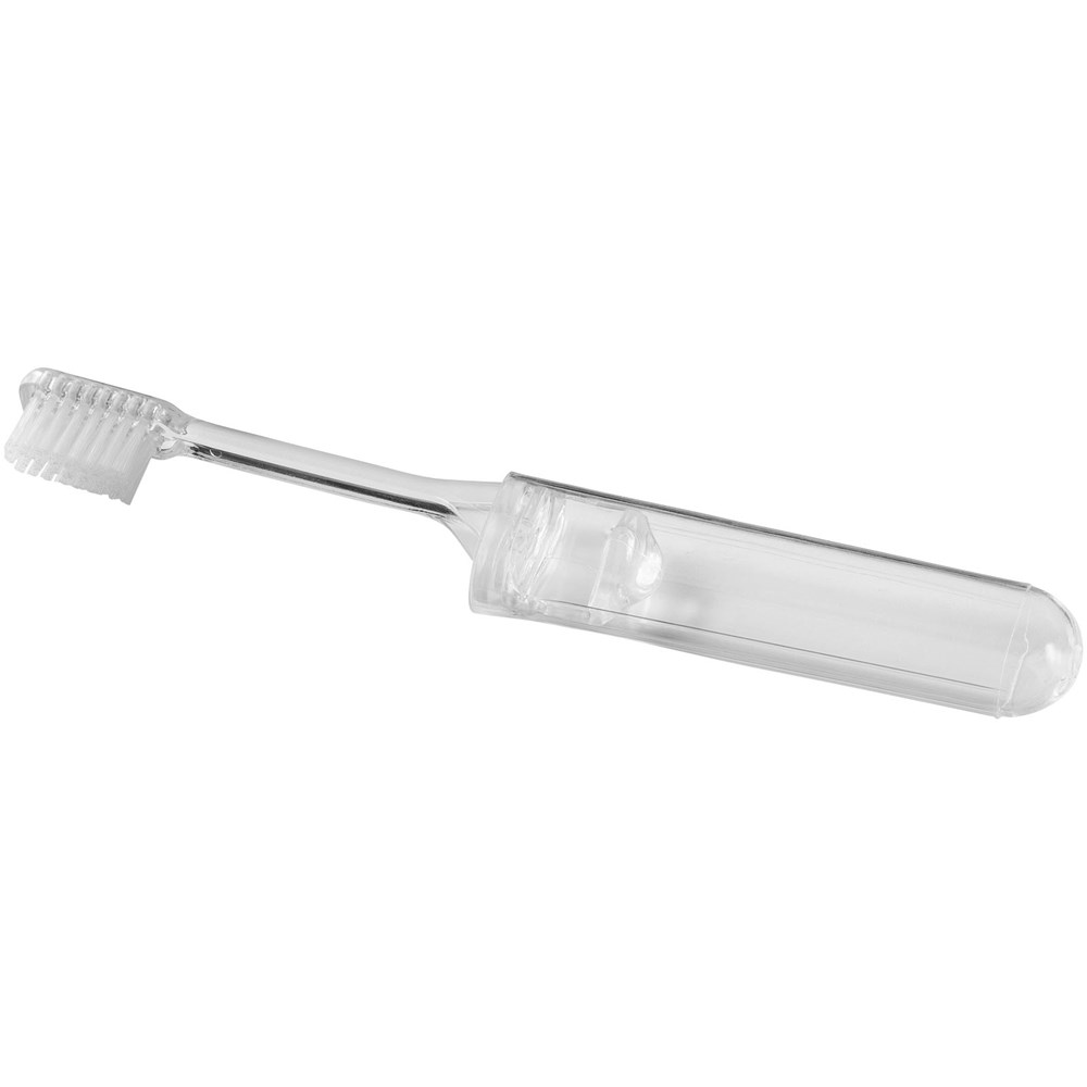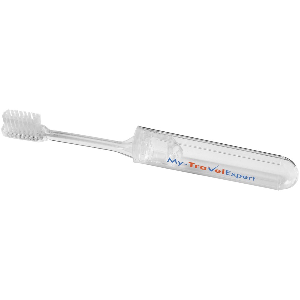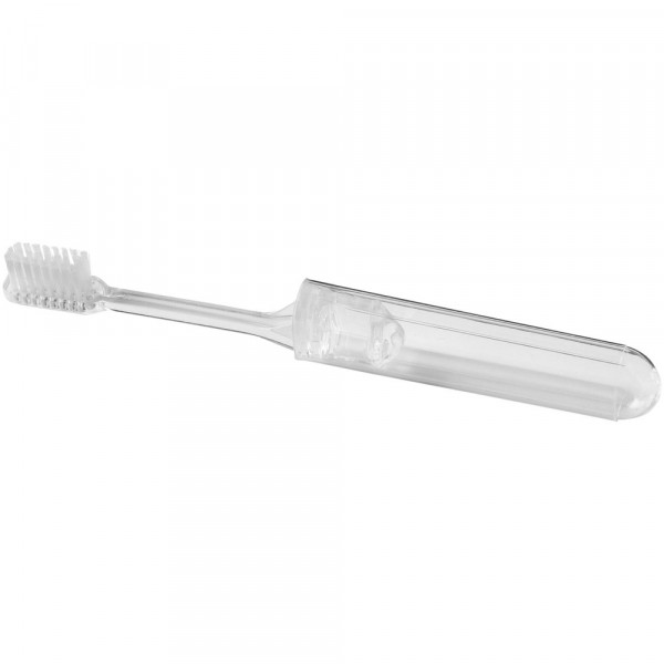 Kompakte Zahnbürste mit durchsichtiger Hülle. Länge beträgt 17 cm.