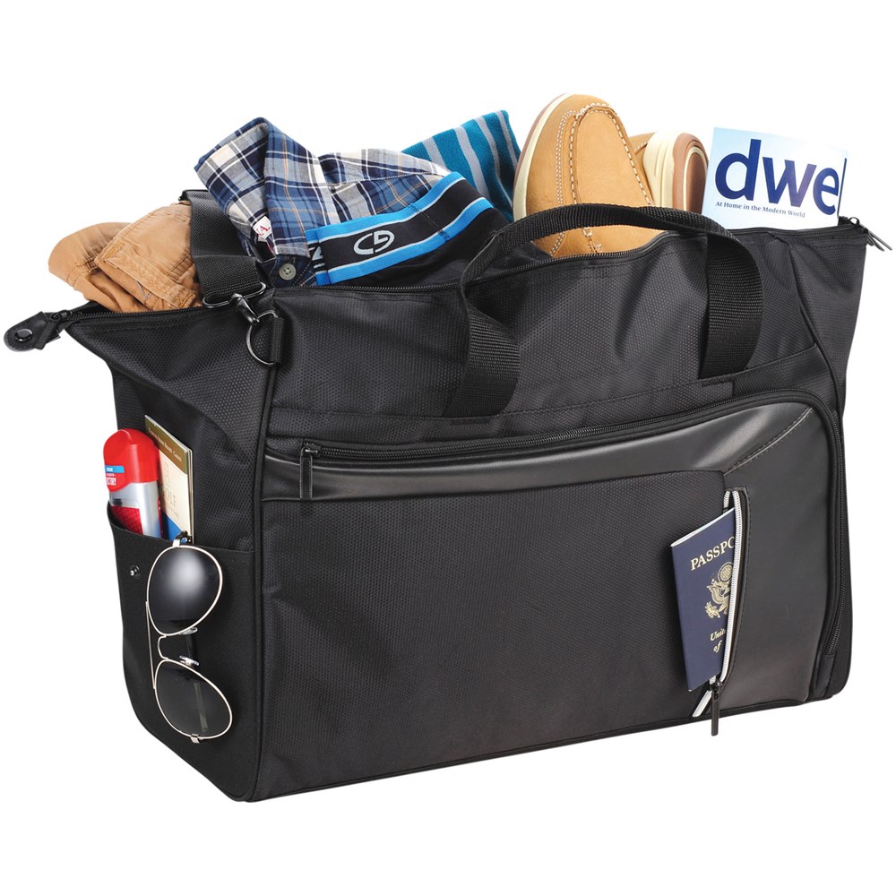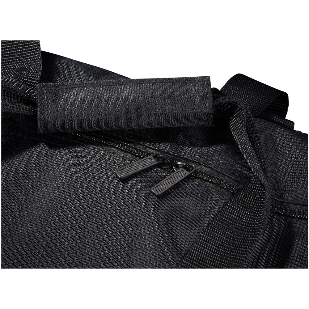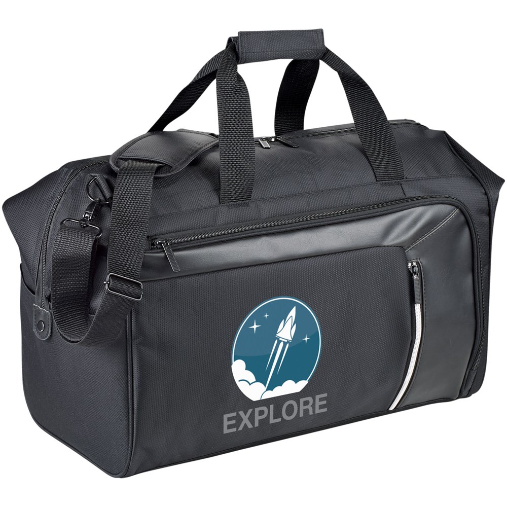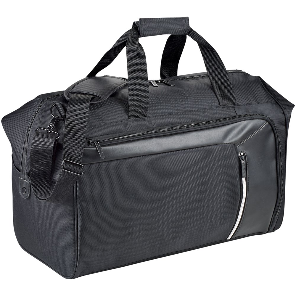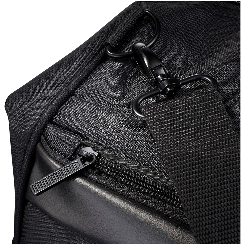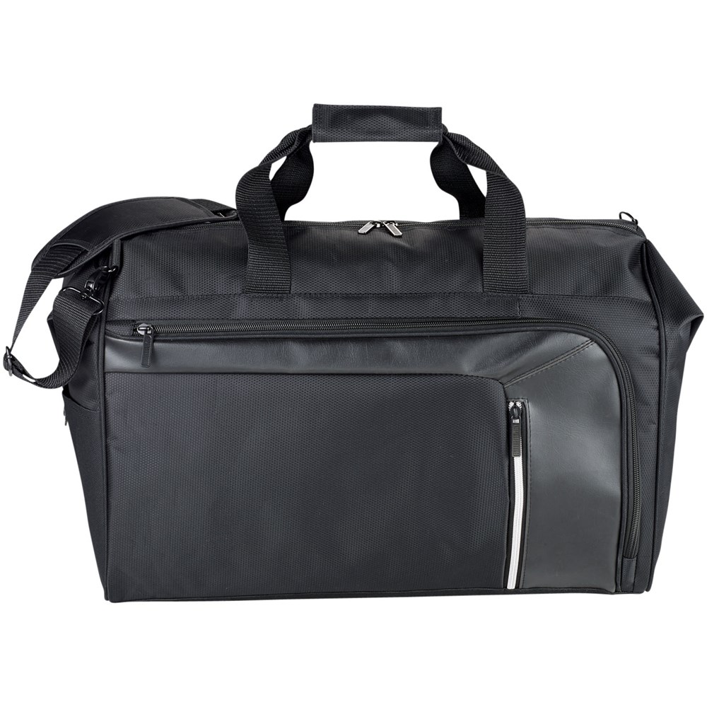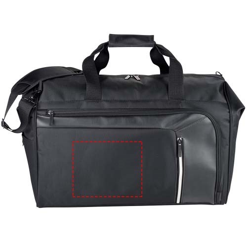 Vault RFID Reisetasche. Reisetasche bietet versteckte RFID Block Technologie in der Vordertasche, um Ihre Karten und Ihren Ausweis vor Identiätsdiebstahl zu schützen. Inkl. Reißverschluss Organisationsfach vorne und einem großen Reißverschluss Hauptfach. Abnehmbare, gepolsterte Schultergurte für verbesserten Komfort. Trolley Befestigung auf der Rückseite für leichteres Reisen. 600D Poly Canvas mit Dobby Akzenten.