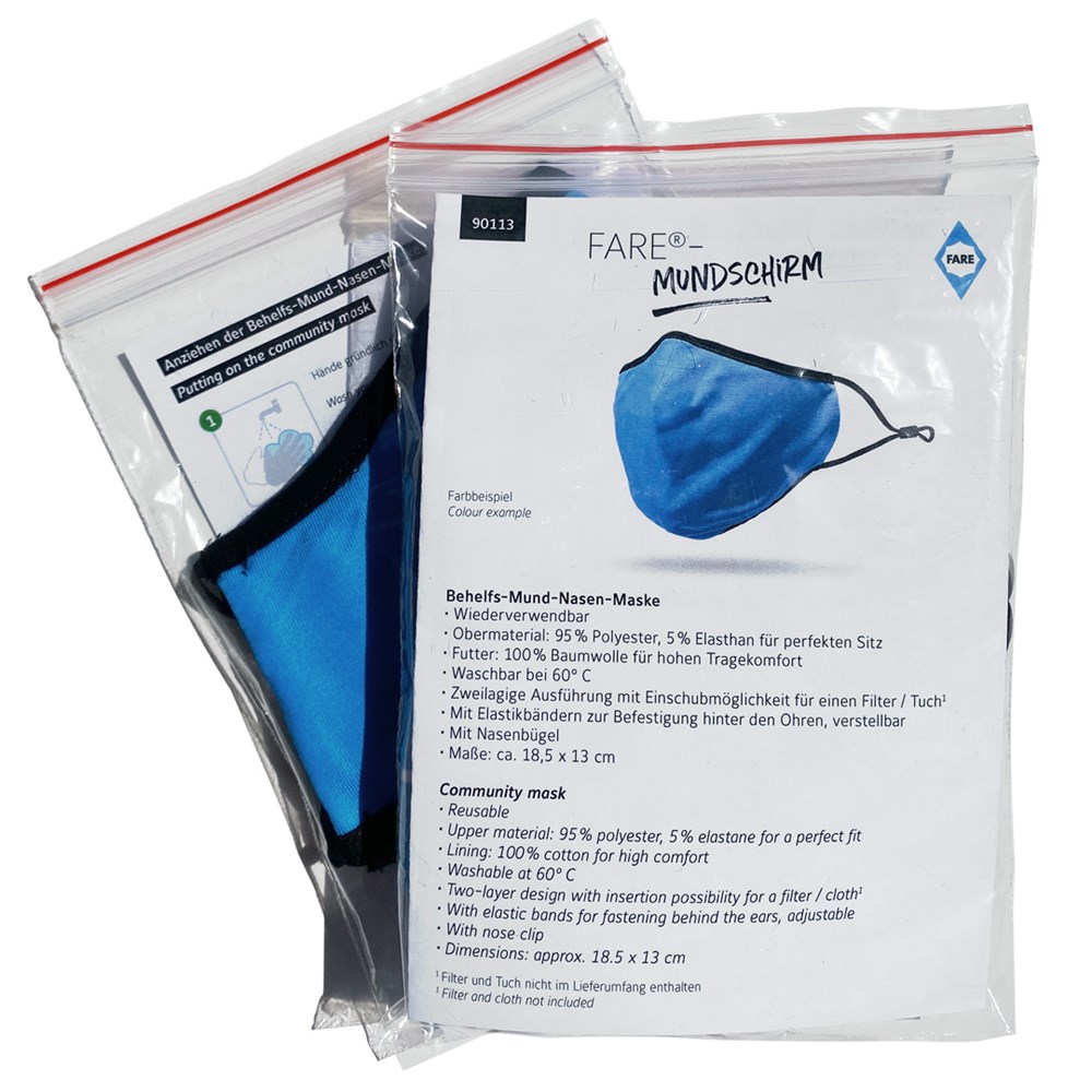 Wiederverwendbare Community Maske, Obermaterial mit 5% Elasthan für perfekten Sitz, Futter aus 100% Baumwolle für hohen Tragekomfort, waschbar bei 60°, mit Nasenbügel, einzeln verpackt im wiederverschließbaren Polybeutel mit Farbeinleger