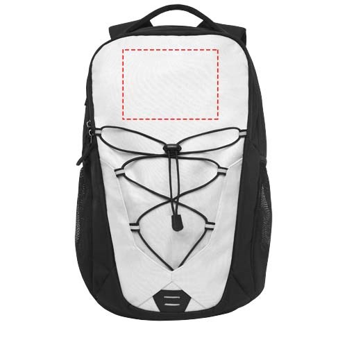 Eine Mischung aus Outdoor- und Alltagsrucksack aus farbigem Stoff und elastischer Kordel mit reflektierenden Akzenten auf der Vorderseite. Ausgestattet mit zwei Netz-Außentaschen für Wasserflaschen, einem Frontfach mit mehreren kleinen Fächern, einem Haken und einer 12-Zoll-Tablethülle. Der Rucksack hat einen gepolsterten, verstärkten Griff und eine bequeme, gepolsterte Rückseite. Geeignet für einen 15,6-Zoll-Laptop in einer gepolsterten Hülle im Hauptfach.