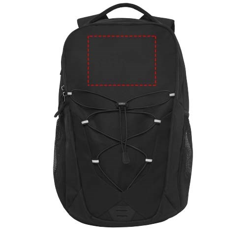 Eine Mischung aus Outdoor- und Alltagsrucksack aus farbigem Stoff und elastischer Kordel mit reflektierenden Akzenten auf der Vorderseite. Ausgestattet mit zwei Netz-Außentaschen für Wasserflaschen, einem Frontfach mit mehreren kleinen Fächern, einem Haken und einer 12-Zoll-Tablethülle. Der Rucksack hat einen gepolsterten, verstärkten Griff und eine bequeme, gepolsterte Rückseite. Geeignet für einen 15,6-Zoll-Laptop in einer gepolsterten Hülle im Hauptfach.