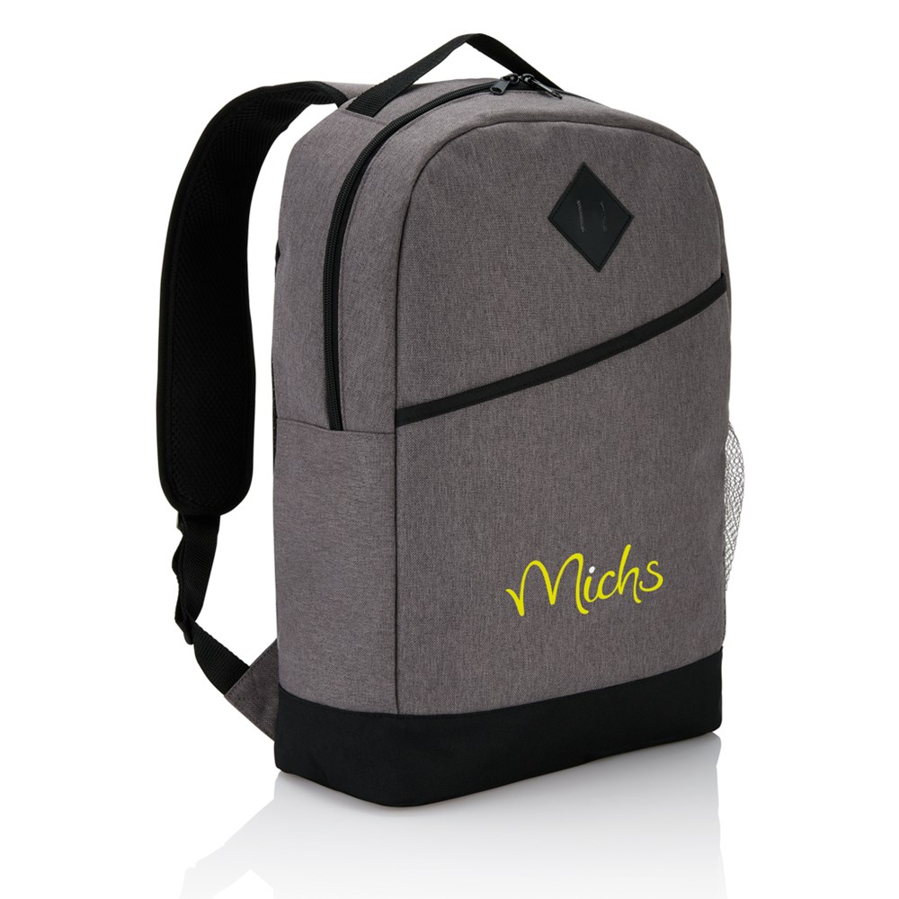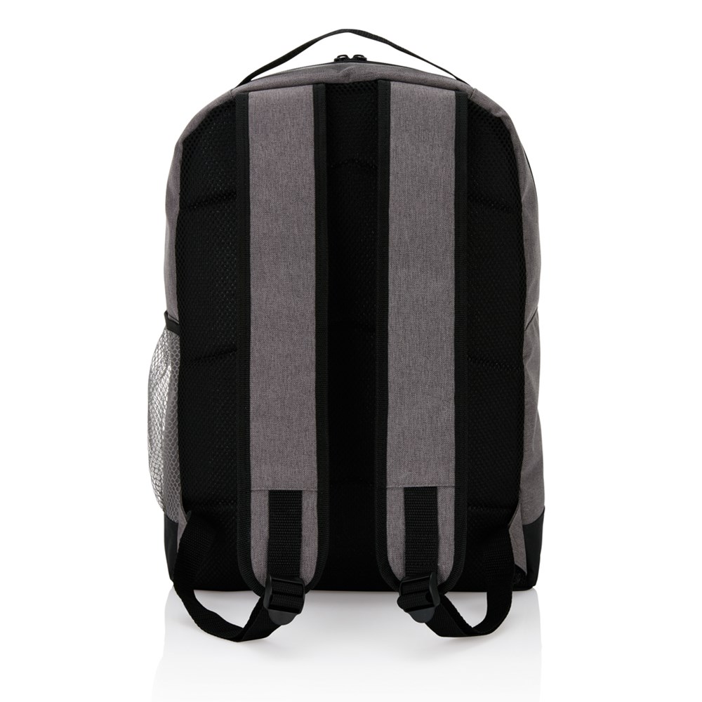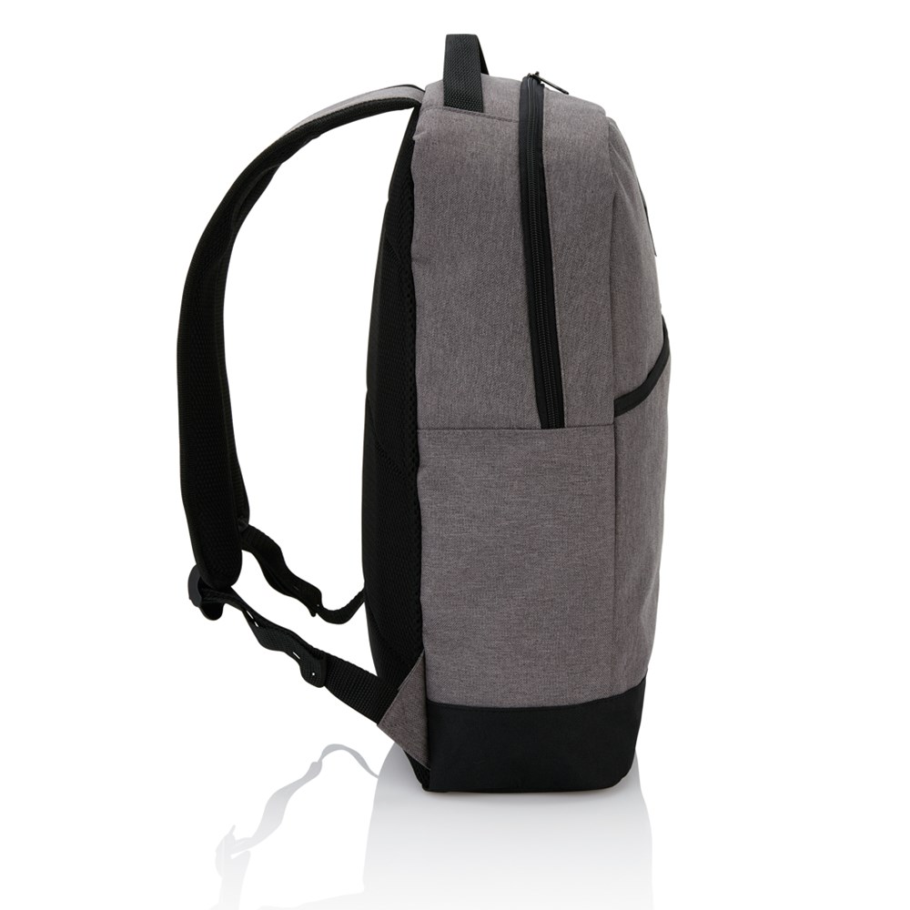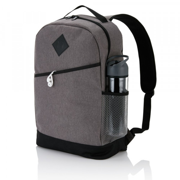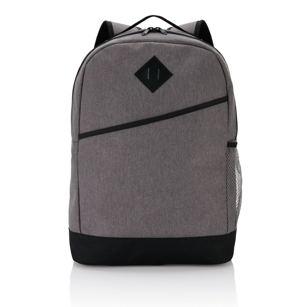 Moderner, zweifarbiger 600D Polyester Rucksack, inkl. Hauptfach mit Reißverschluss, Frontfach mit Klettverschluss, seitlicher Netztasche und verstellbaren, gepolsterten Schulterriemen. Gepolsterte Rückenwand mit luftdurchlässigem Netzmaterial. PVC-frei.