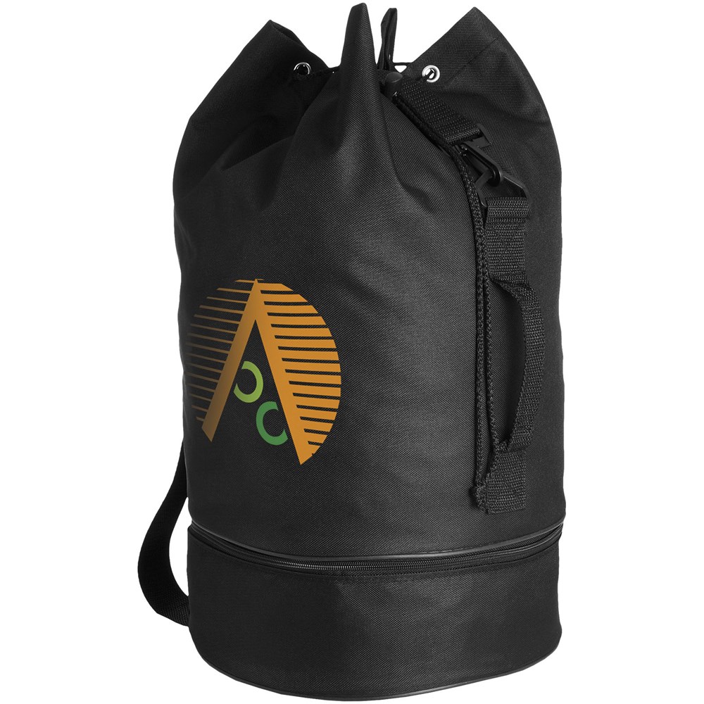 Seesack mit Kordelzugverschluss, seitlichem Griff und einstellbarem Schulterriemen. Mit separatem Reißverschlussfach unten.