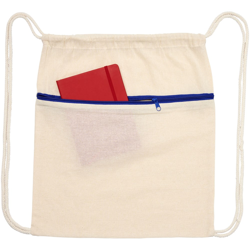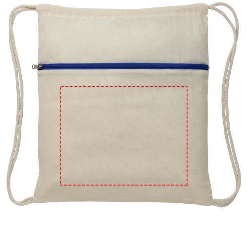 Großes Hauptfach mit Kordelzugverschluss aus Baumwolle. Ausgestattet mit einer farbigen Fronttasche mit Reißverschluss. Beständigkeit bis zu 5 kg.