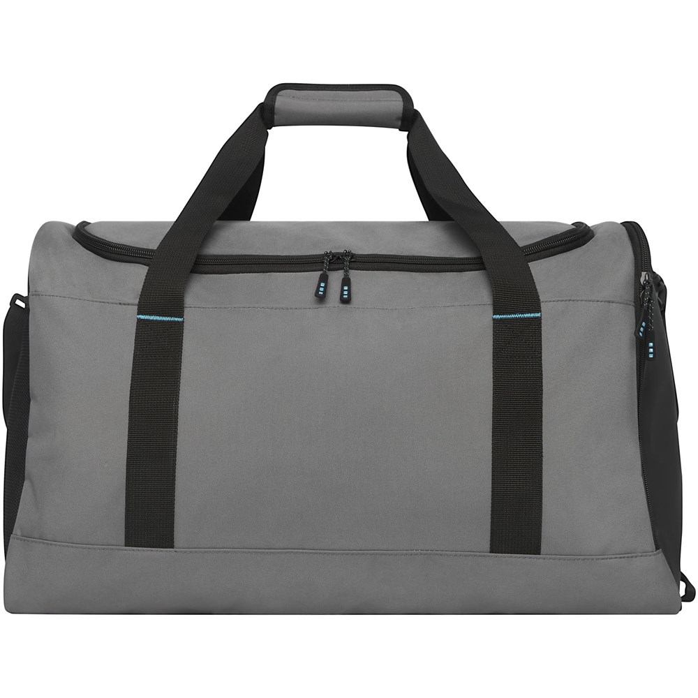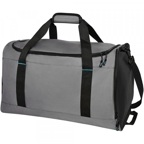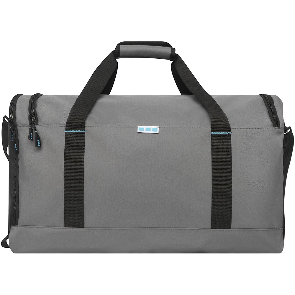 Nachhaltiger GRS-zertifizierter RPET-Seesack aus 55 % recycelten Materialien. Ausgestattet mit einem großen Hauptfach mit Reißverschluss, einer verstärkte Basisplatte, einer seitliche Netztasche und einer erweiterbaren Nass-/Trockentasche mit Reißverschluss. Kommt mit einer kleinen Innentasche mit Reißverschluss zur Organisation, einem abnehmbaren und gepolsterten Schultergurt, Haltegriffen mit gepolstertem Klettverschluss und einem zusätzlichen Haltegriff auf der rechten unteren Seite.