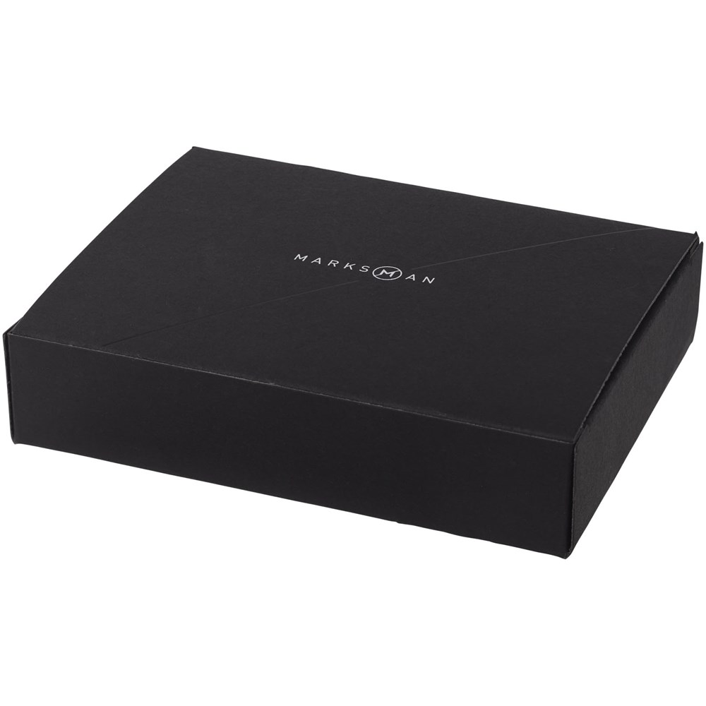 RFID-Geldbörse mit Schutz und Geheimfächern, wie einer versteckten Schlüsselhülle, einer versteckten Rückwand für zusätzliches Bargeld, einer Tasche für zusätzliche Karten mit leicht zugänglicher Aufreißlasche, vier Kartentaschen, einer vorderen Tasche sowie einer Bargeldtasche. Präsentiert in einer Marksman-Geschenkschachtel.