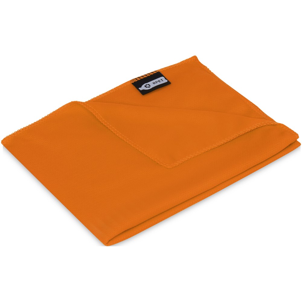 Schnell absorbierendes, schnell trocknendes und waschbares Kühlhandtuch aus recyceltem PET Kunststoff. Wird in einem kleinen Netzbeutel aus recyceltem PET Kunststoff mit Verschluss zum einfachen Transport geliefert. Erhältlich in 5 frischen Farben. Große Werbeanbringungsfläche auf dem Etui (Größe 15 x 11,5 cm). Werbeanbringung auch auf dem Kühlhandtuch selbst möglich (Größe 80 x 30 cm).