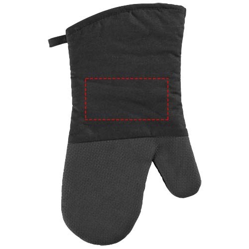Ofenhandschuh mit Silikongriff und Rautenmuster auf der anderen Seite. Die Handschuhöffnung beträgt 14 cm.