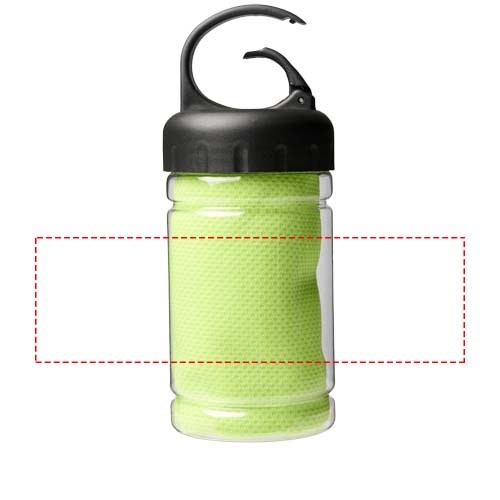 Schnell einziehendes, schnell trocknendes und waschbares kühlendes Handtuch aus starkem und strapazierfähigem Polyester, perfekt um während des Trainings oder bei allen Outdoor-Aktivitäten kühl zu bleiben. Wird in einem PET-Behälter mit Tragegriff und integriertem Karabinerhaken für einfaches Tragen geliefert. Erhältlich in 5 frischen Farben. Große Deko-Logofläche auf dem Behälter, Dekoration auch auf dem Kühlhandtuch selbst möglich. Größe 30 x 80 cm.