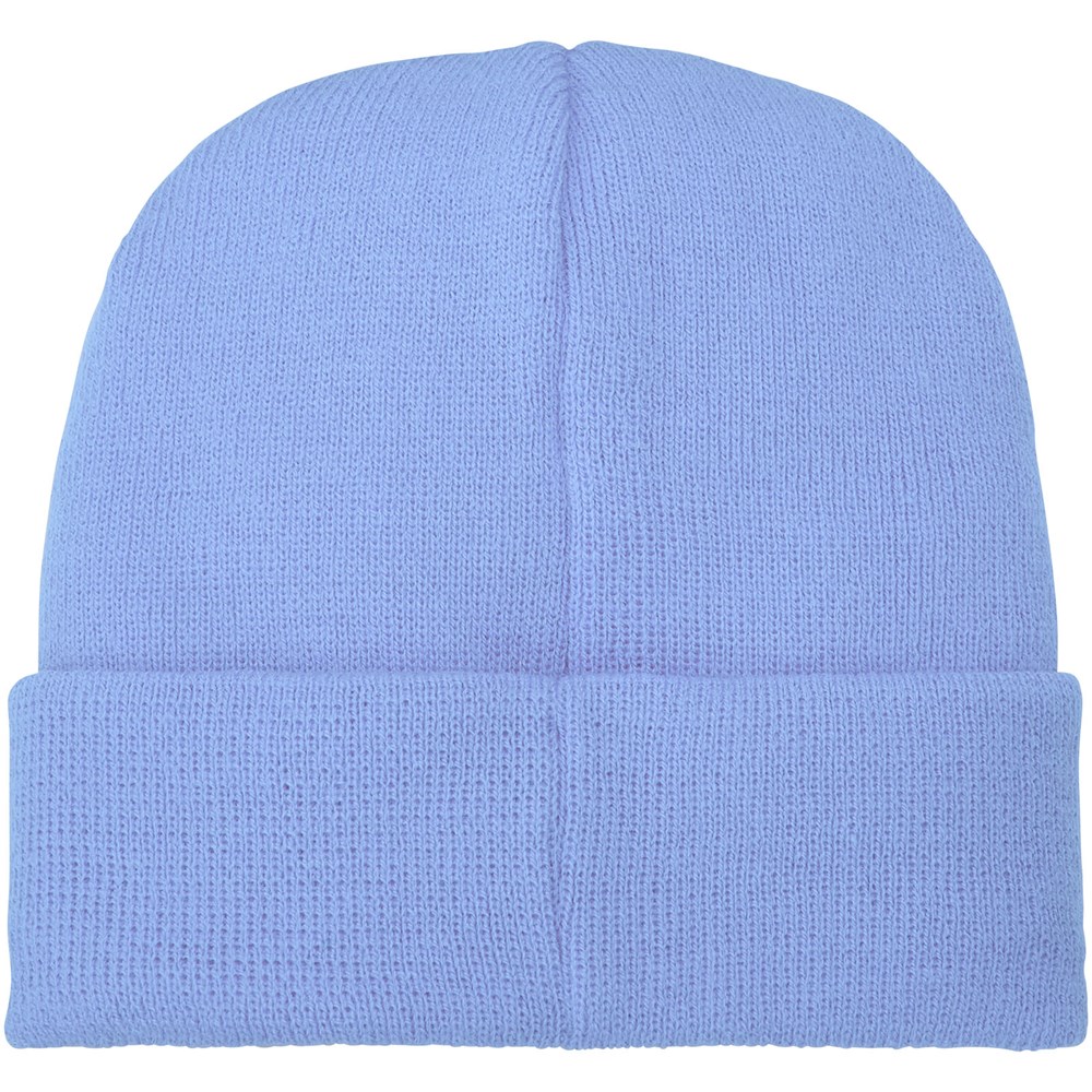 Einlagiger Beanie mit doppelt gefaltetem Rand. Aufnäher für die Werbeanbringung.