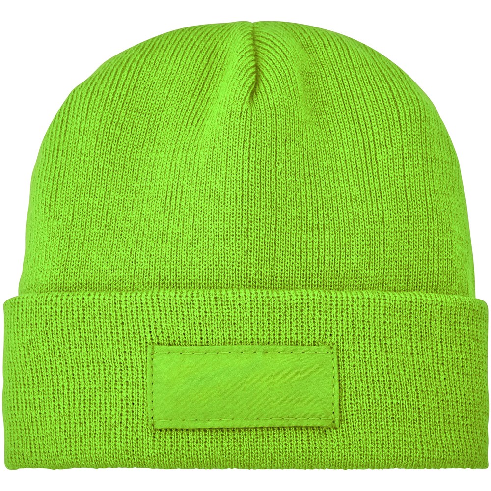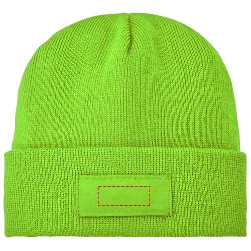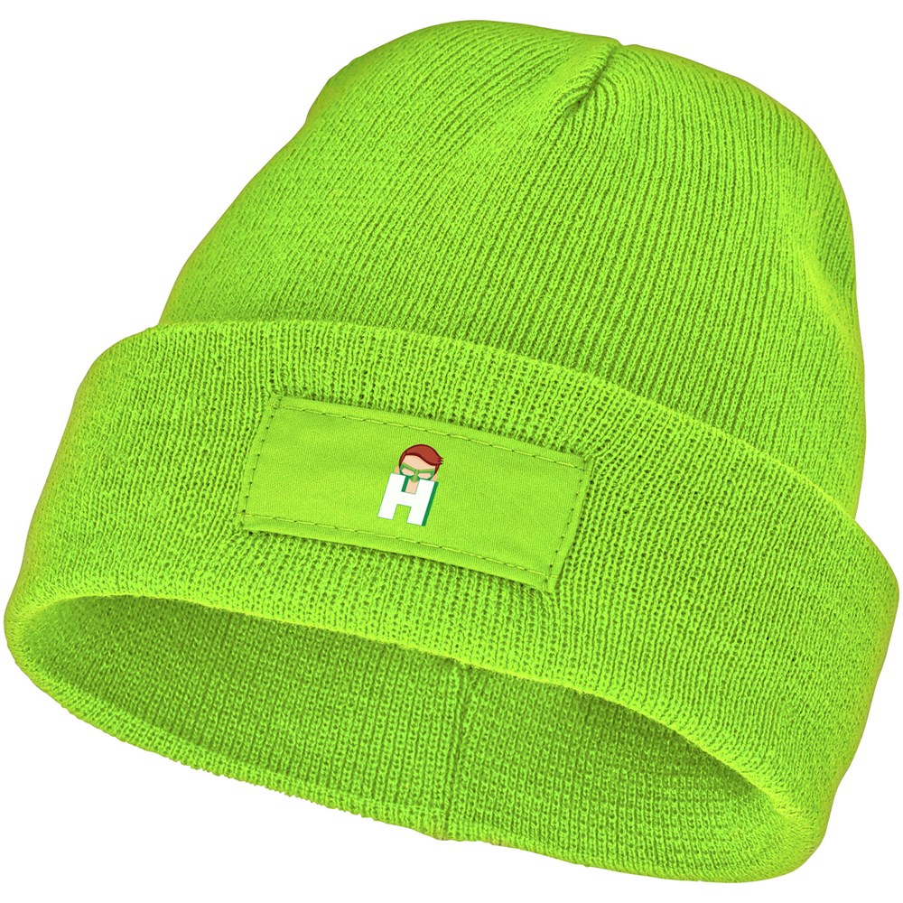 Einlagiger Beanie mit doppelt gefaltetem Rand. Aufnäher für die Werbeanbringung.