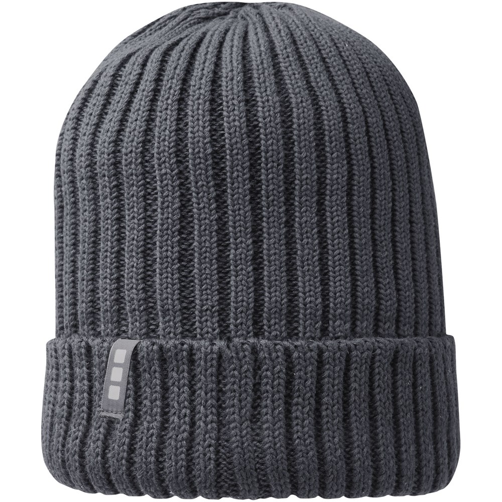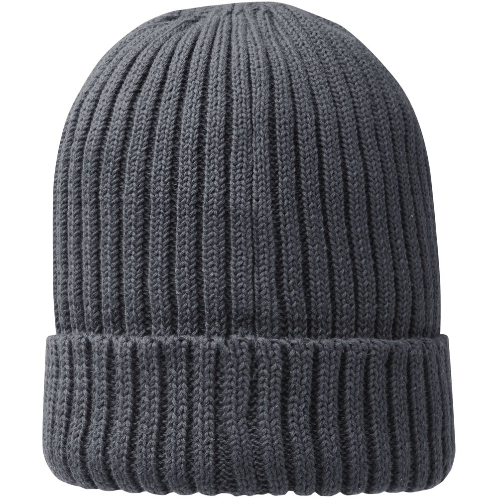 Nachhaltige Mütze für Werbezwecke. Einlagige Mütze mit doppelt gefaltetem Rand. Schlaufenetikett mit Markenlogo.