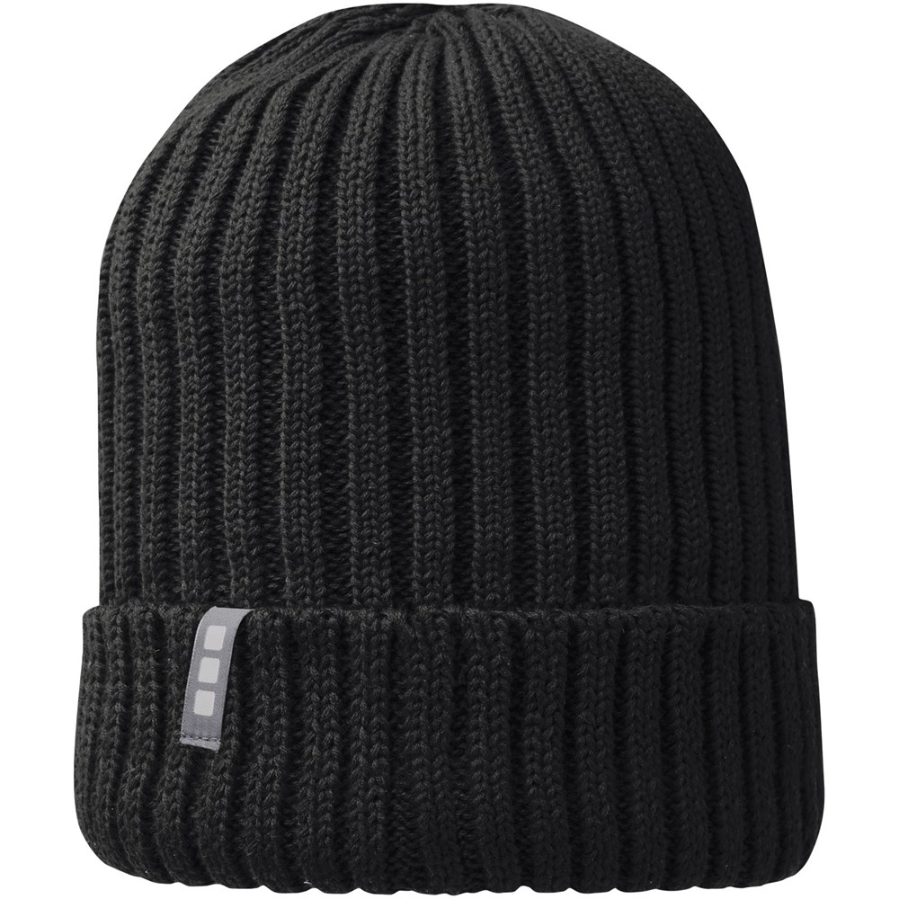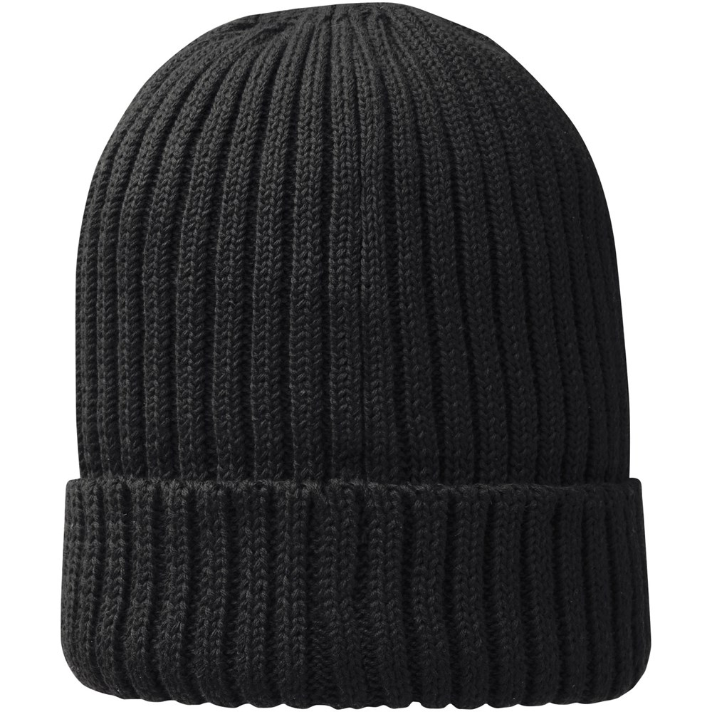 Nachhaltige Mütze für Werbezwecke. Einlagige Mütze mit doppelt gefaltetem Rand. Schlaufenetikett mit Markenlogo.