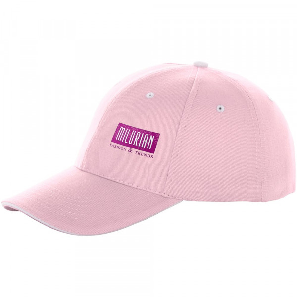 Gebogener Schirm mit Sandwich. Gestickte Ösen in Kontrastfarbe zur Belüftung. Gewebe-Klettverschluss. Passende Farben zwischen dem Sandwich, den Ösen, der Krone und dem Verschluss. Kopfumfang: 58 cm.