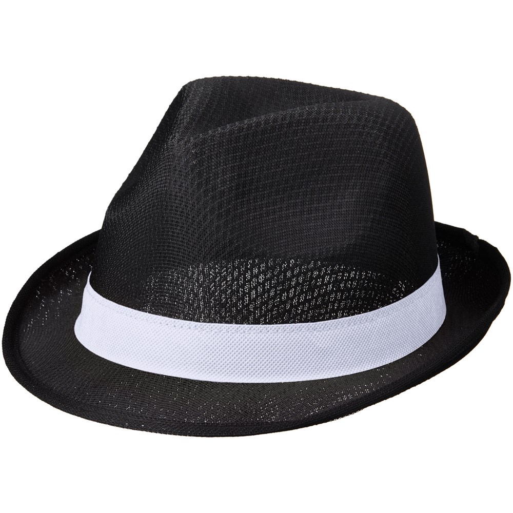 Ein Polyesterhut im Trilby-Stil mit einem Kopfumfang von 58 cm ; Einheitsgröße. Die Hüte können auf dem Zierband aus Polypropylen (100 g/m²) individuell mit Logos usw. gestaltet werden.