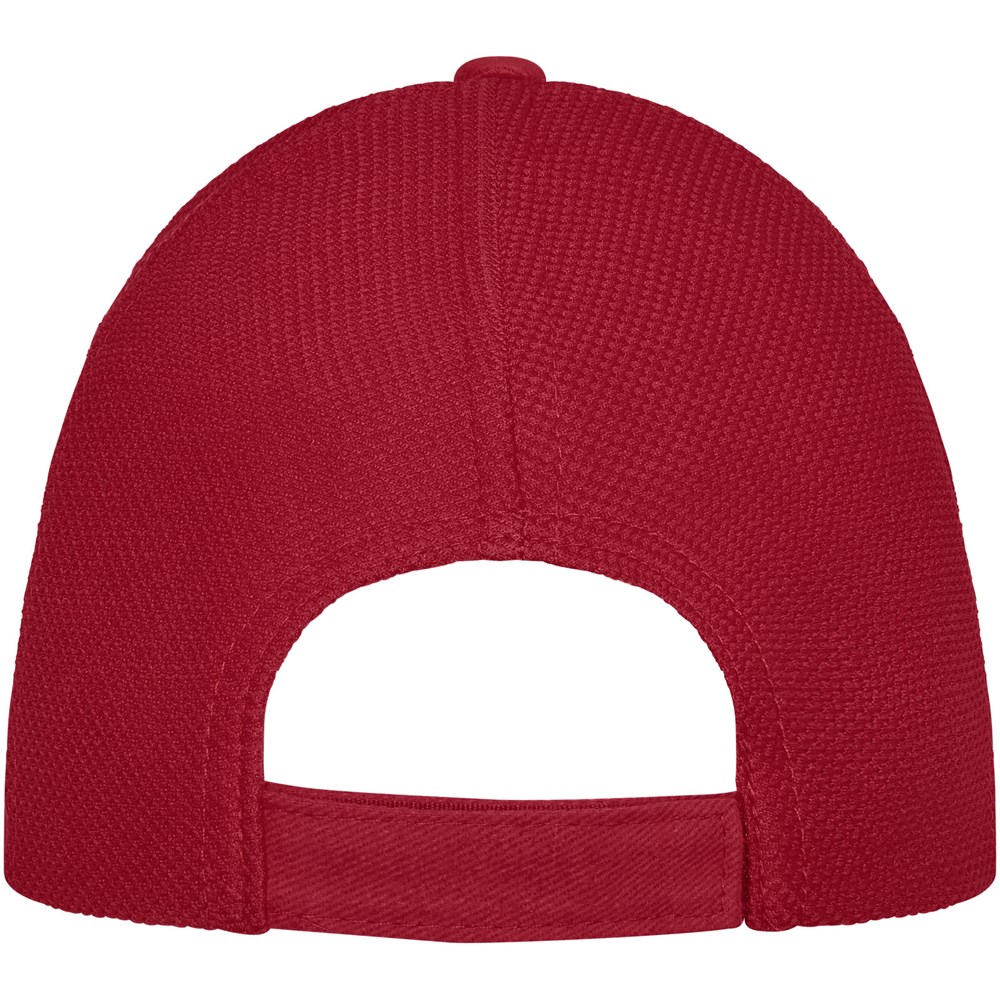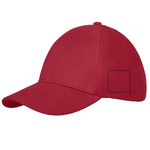 Gebogener Schirm. Rückenpaneele aus Mesh-Gewebe. Verschluss und Schlaufe aus Stoff.