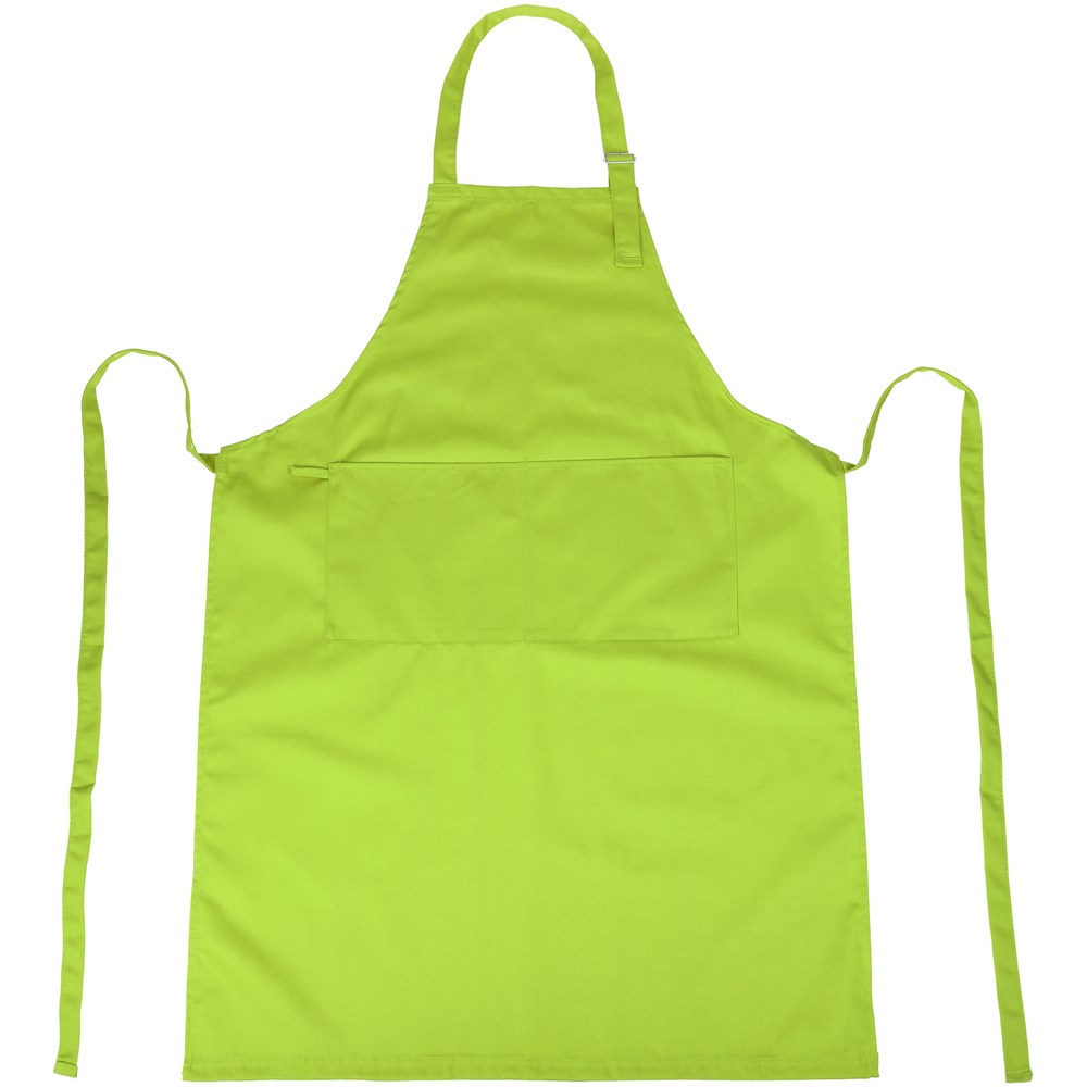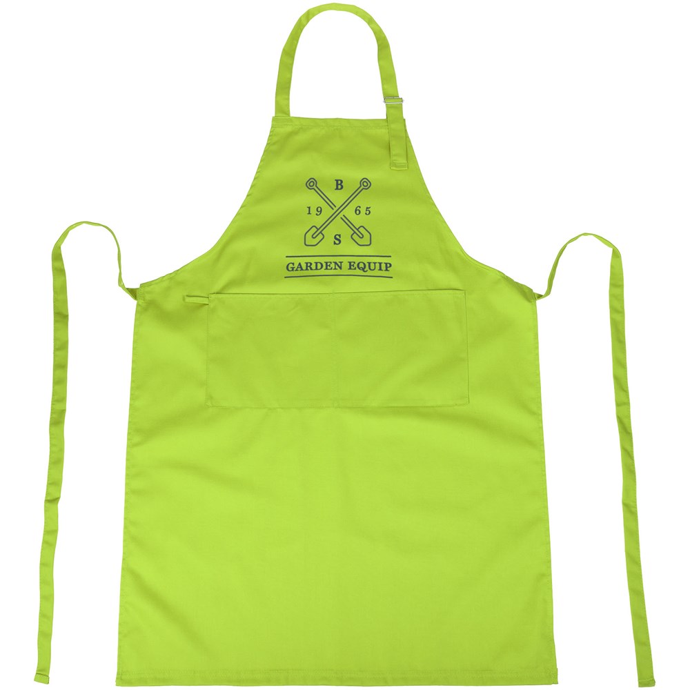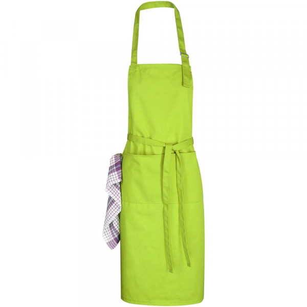 Schürze mit Schnalle an der Nackenschlaufe, um die richtige Größe einzustellen und Bindeband im Rückenbereich. Mit zwei Vordertaschen und Handtuchschlaufe.