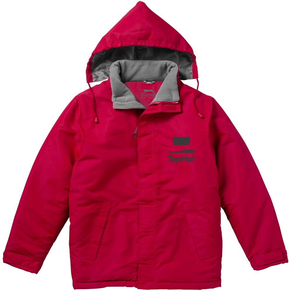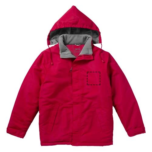 200mm wasserfest. Kapuze mit elastischer Öffnung, einrollbar . größenverstellbare Bündchen mit Klettverschluss. Fronttaschen. Halbmond. Aufhängeschlaufe. Transfer Hauptlabel für den etikettfreien Komfort..