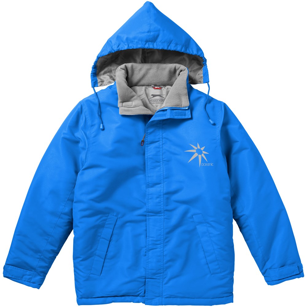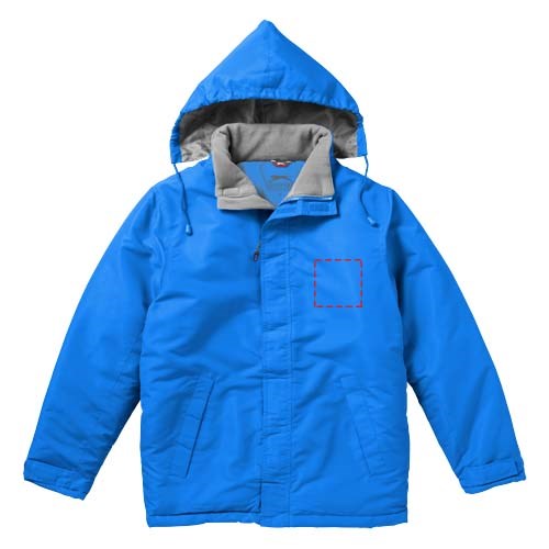 200mm wasserfest. Kapuze mit elastischer Öffnung, einrollbar . größenverstellbare Bündchen mit Klettverschluss. Fronttaschen. Halbmond. Aufhängeschlaufe. Transfer Hauptlabel für den etikettfreien Komfort..