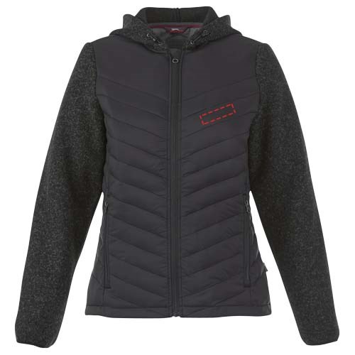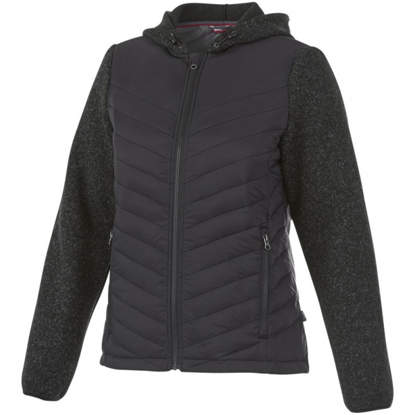 Steppgewebe mit Kontraststoff aus Strickgewebe. Mediatasche in der rechten Innentasche. Elastischer Kordelzug mit verstellbaren Stoppern. Anliegende Seitenähte und tailliert für schmeichelnde Passform. Kinnschutz. Seitentaschen mit Reißverschluss. Mittig sichtbarer Kunststoff Reißverschluss. Aufhängeschlaufe. 2-farbiges Nackenband. Label an Seitennaht.
