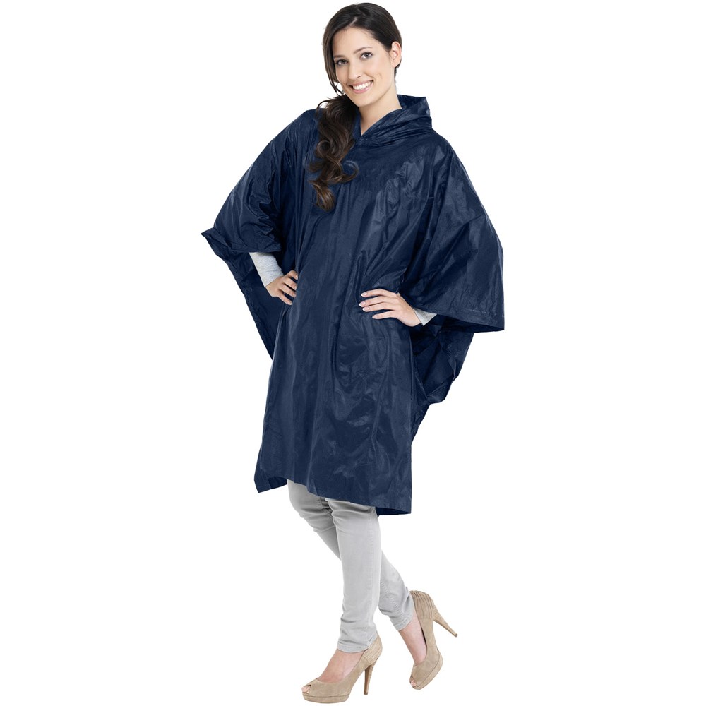 Ein faltbarer Poncho mit Kapuze für unerwartete Regenschauer bei jeder Outdoor-Aktivität. Der wiederverwendbare Poncho ist 100x130 cm groß und hat auf jeder Seite einen Knopfverschluss. Erhältlich in vielen verschiedenen Farben mit einer großen Dekorationsfläche auf dem Beutel.