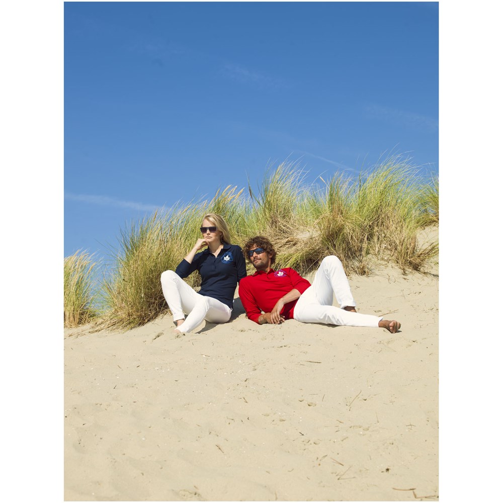 Flachstrickkragen. 2-er Knopfleiste mit gravierten Knöpfen. 2-farbiges Nackenband. Gravierte Ton-in-Ton Knöpfe. Transfer Hauptlabel für den etikettfreien Komfort.. Label an Seitennaht.