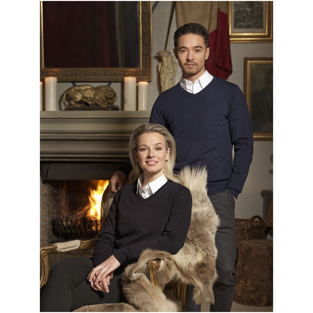 V-Ausschnitt. Flachstrickkragen. 1x1 Rippstrickkragen und Bund. Elastischer 2x2 Rippstrickbund.... mehr