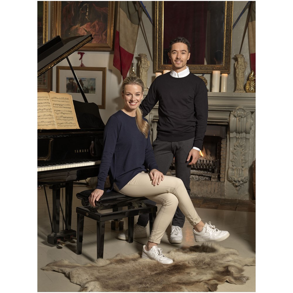 Rundhalsausschnitt. Flachstrickkragen. 1x1 Rippstrickkragen und Bund. Elasischer 2x2 Rippstrickbund. Satin Nackenband. Transfer Hauptlabel für den etikettfreien Komfort.