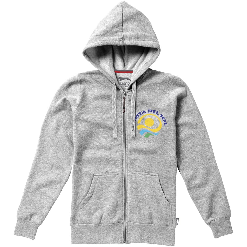 1x1 Rippstrickkragen und Bund. Elasischer 2x2 Rippstrickbund. Kängurutasche. Herren und Damen Modell mit Kordelzug in Kapuze. Tailliert für eine schmeichelhafte Passform. Easy Grip Reißverschluss Puller. Halbmond. 2-farbiges Nackenband. Antike silberne Ösen mit graviertem Logo. Label an Seitennaht.
