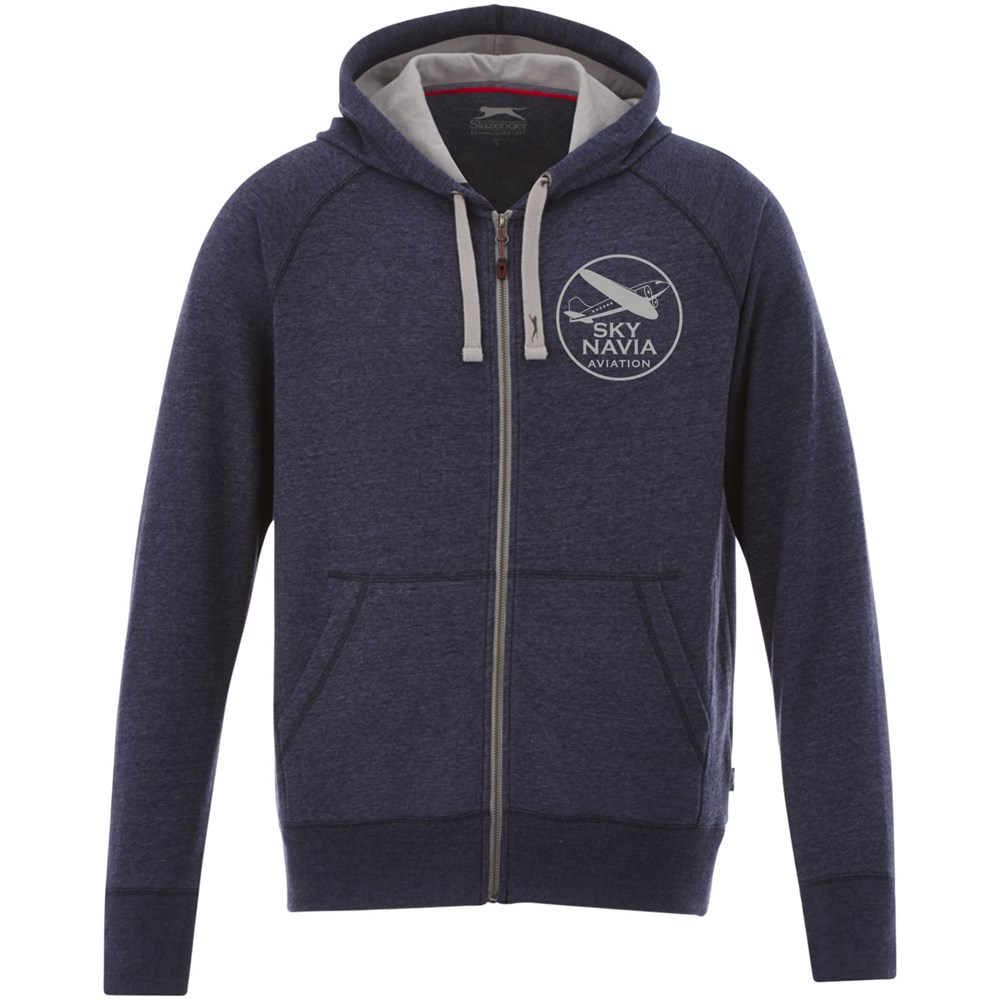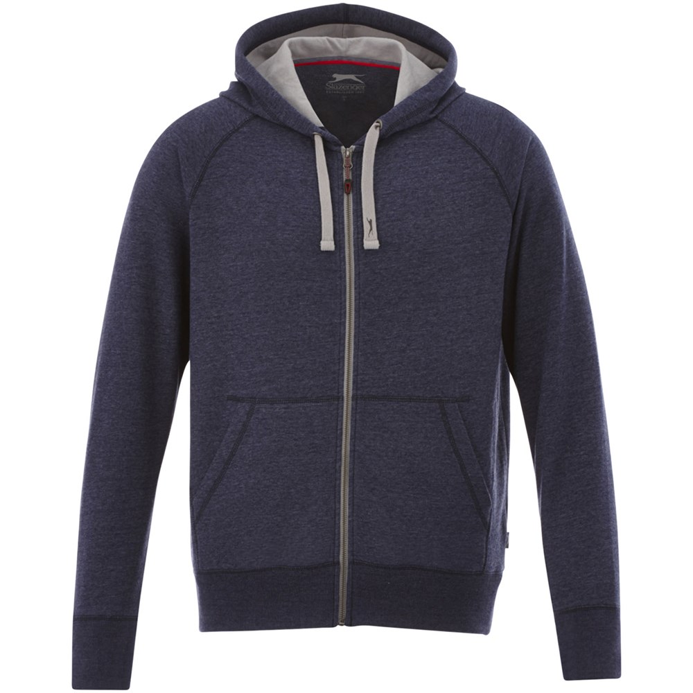 Kontrastfarbiges Single-Jersey Futter. Mediatasche in der rechten Innentasche. Daumenlöcher. Herren und Damen Modell mit Kordelzug in Kapuze. Kängurutasche. Kontrastfarbige Flatlock-Naht. Elasischer 2x2 Rippstrickbund. 1x1 Rippstrickkragen und Bund. Metall-Reißverschluss. 2-farbiges Nackenband.