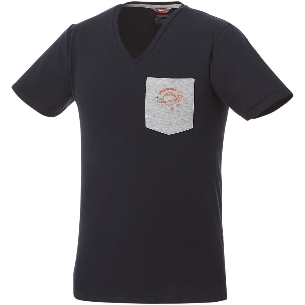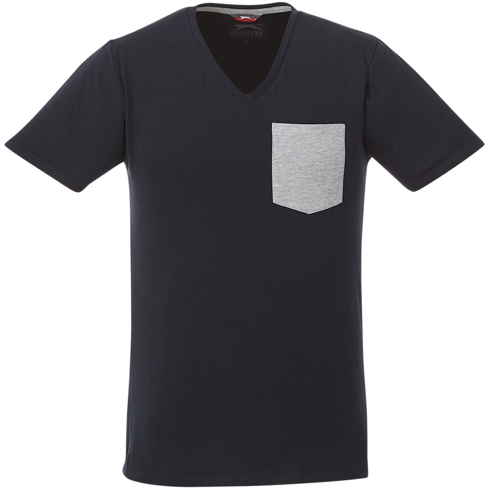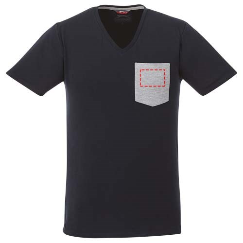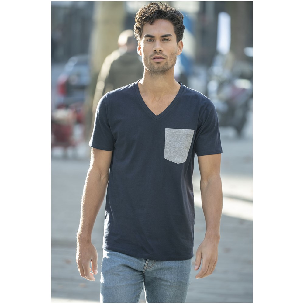 Schlauchware. V-Ausschnitt. Brusttasche. Schulter zu Schulter Nackenband. Doppelnaht an Kragen und Saum. Kontrastfarbene Aufhängeschlaufe. Transfer Hauptlabel für den etikettfreien Komfort..